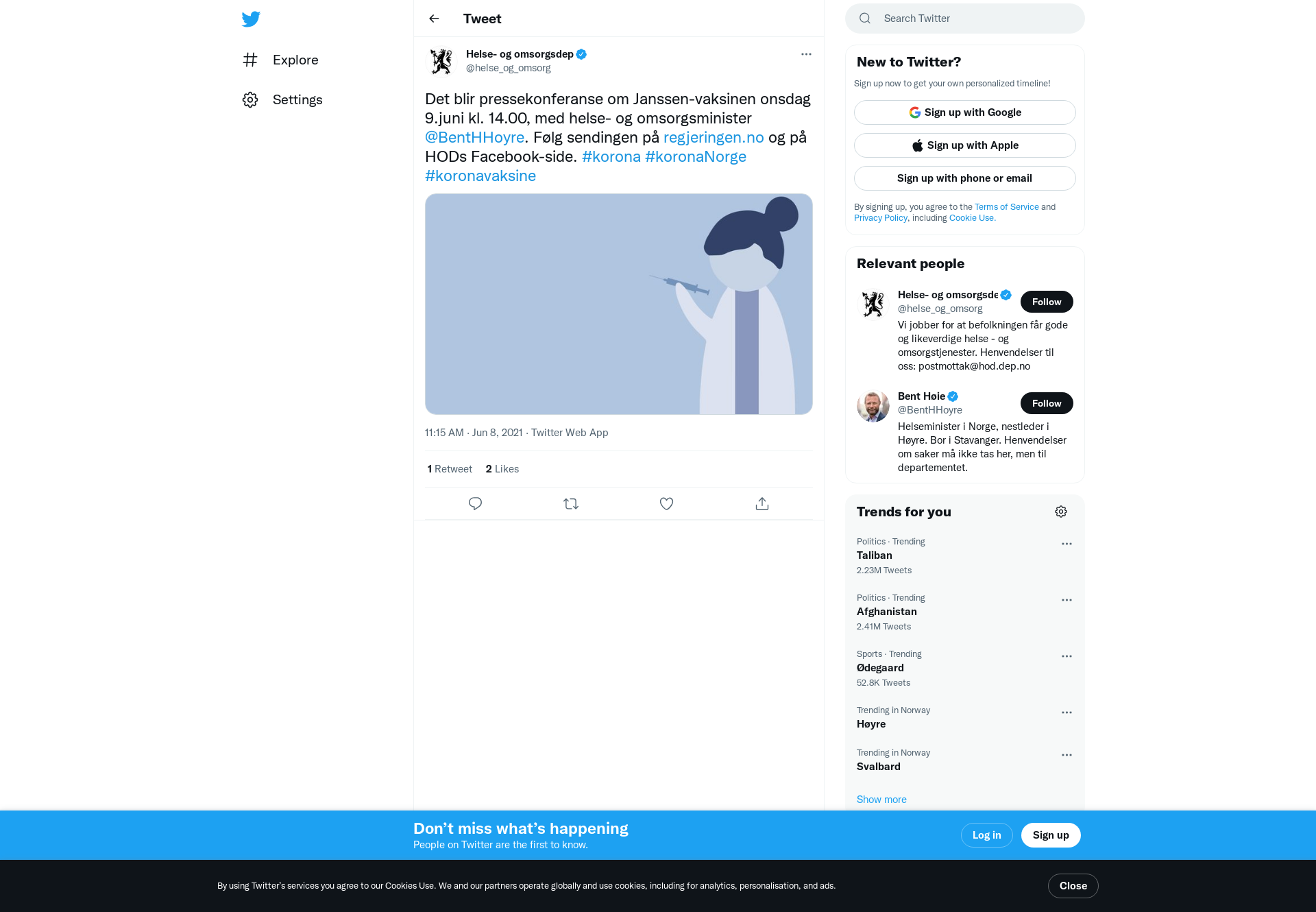 Det blir pressekonferanse om Janssen-vaksinen onsdag 9.juni kl. 14.00, med helse- og omsorgsminister @BentHHoyre. Følg sendingen på https://t.co/hF6MQdjqWr og på HODs Facebook-side. #korona #koronaNorge #koronavaksine https://t.co/c0FbyNBWnw
