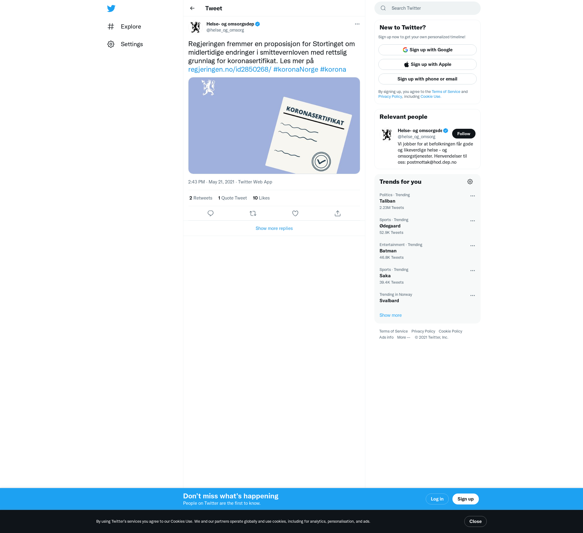 Regjeringen fremmer en proposisjon for Stortinget om midlertidige endringer i smittevernloven med rettslig grunnlag for koronasertifikat. Formålet med de nye bestemmelsene er å etablere et system for sikker og verifisert dokumentasjon av vaksinasjonsst...