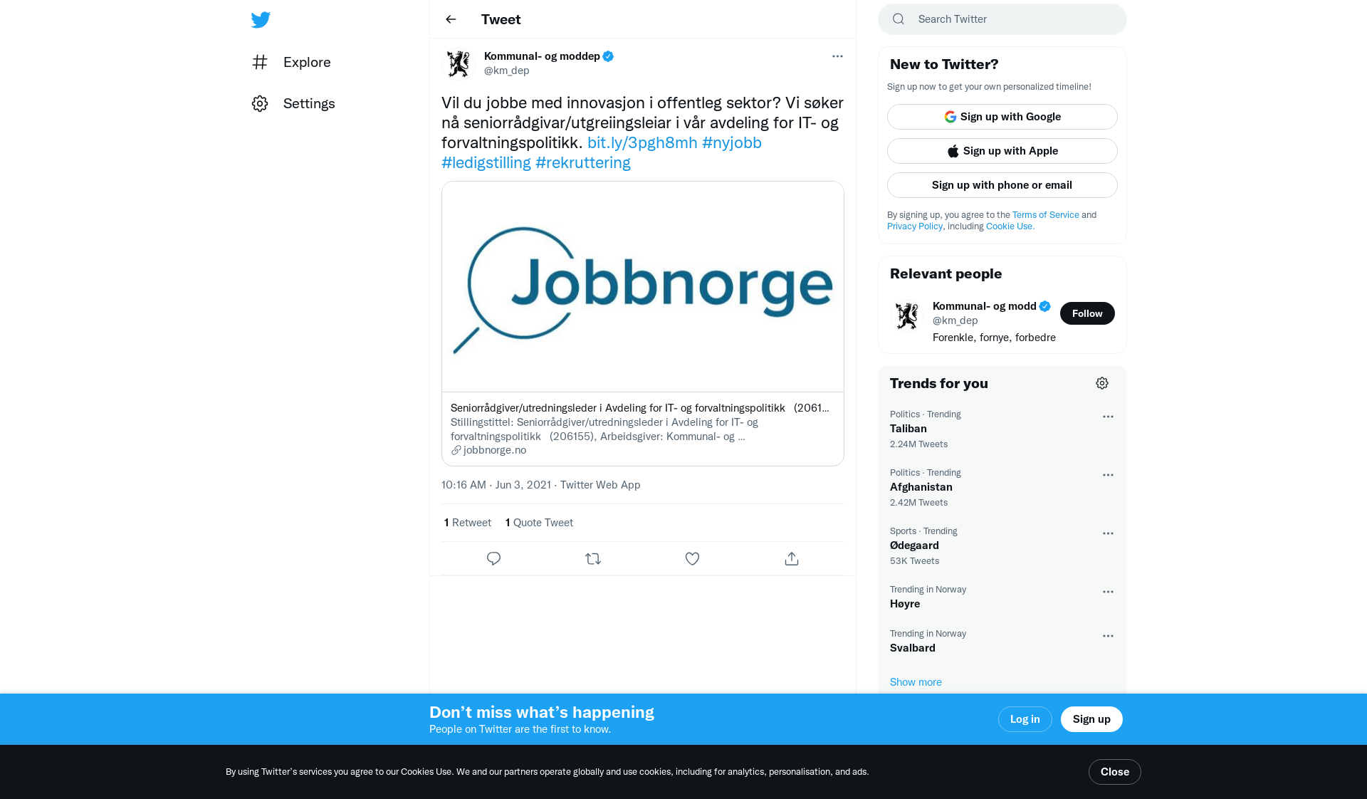 Stillingstittel: Seniorrådgiver/utredningsleder i Avdeling for IT- og forvaltningspolitikk (206155), Arbeidsgiver: Kommunal- og moderniseringsdepartementet, Søknadsfrist: 14. juni 2021