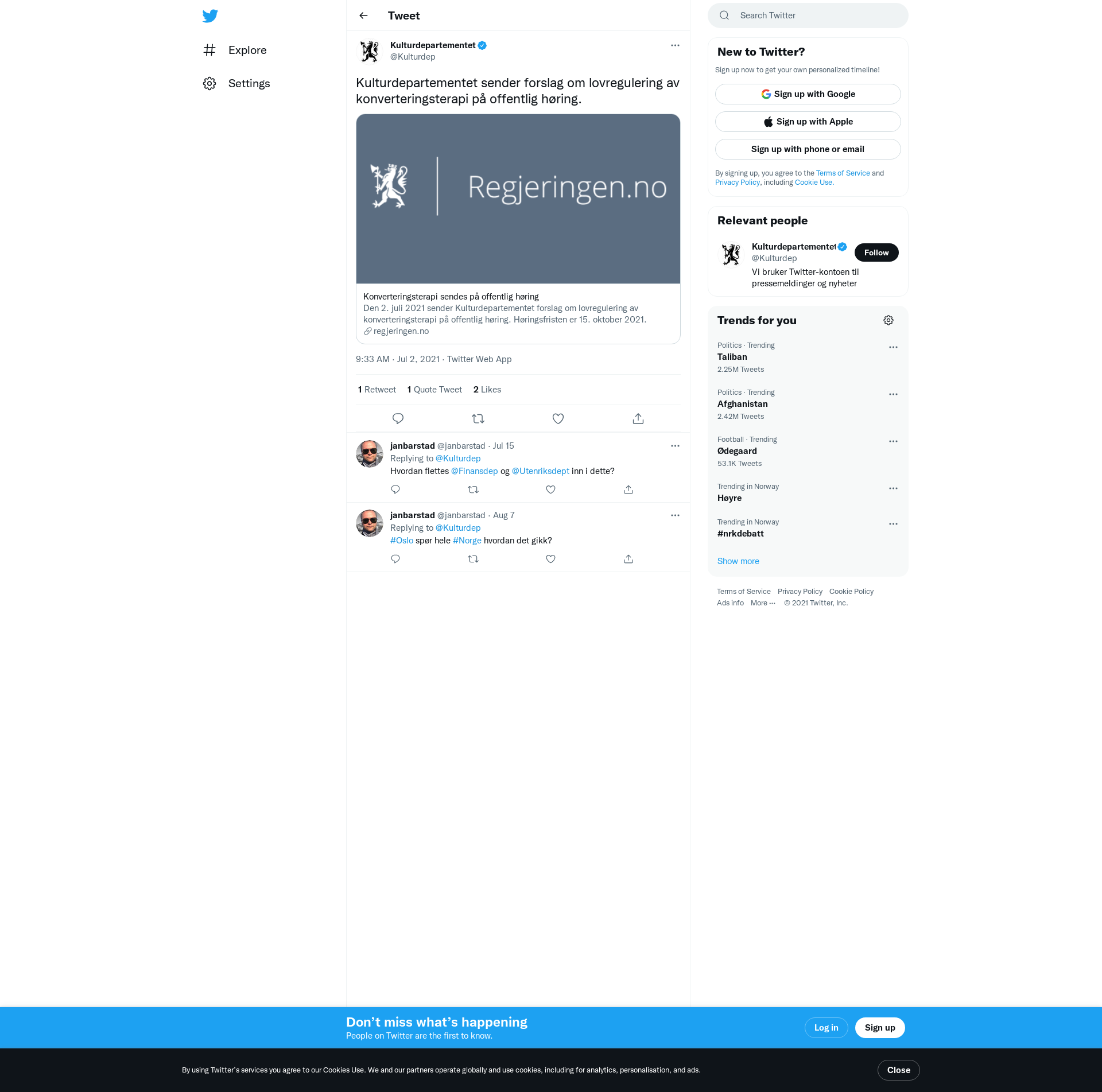 Kulturdepartementet sender forslag om lovregulering av konverteringsterapi på offentlig høring. https://t.co/VjgVpx2SP5