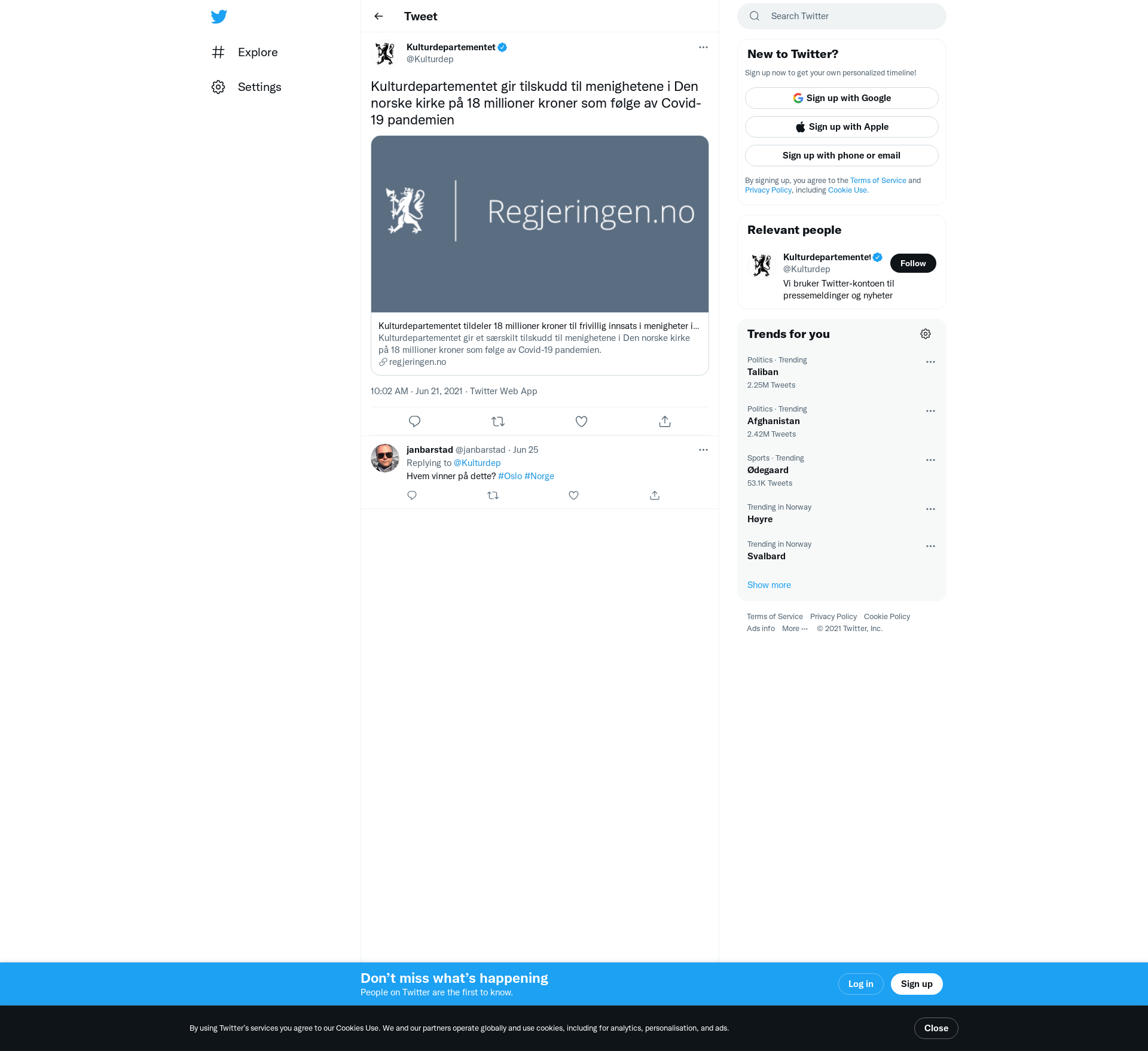 Kulturdepartementet gir et særskilt tilskudd til menighetene i Den norske kirke på 18 millioner kroner som følge av Covid-19 pandemien.
