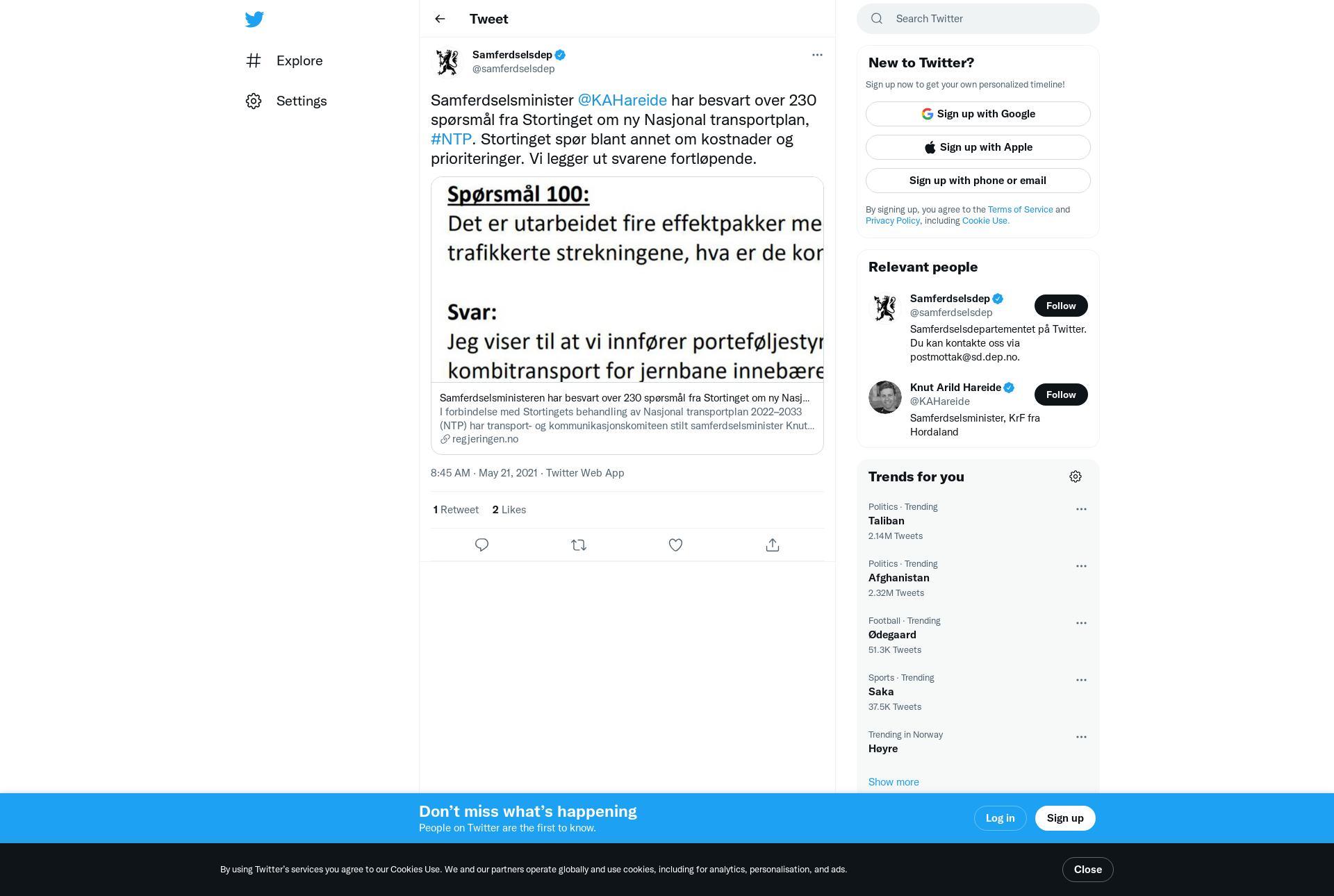I forbindelse med Stortingets behandling av Nasjonal transportplan 2022–2033 (NTP) har transport- og kommunikasjonskomiteen stilt samferdselsminister Knut Arild Hareide over 260 skriftlige spørsmål. Nå er over 230 av dem besvart.