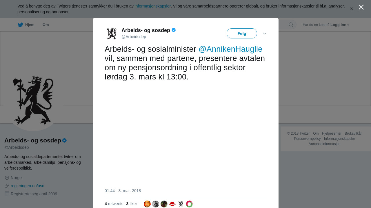 Arbeids- og sosialminister @AnnikenHauglie vil, sammen med partene, presentere avtalen om ny pensjonsordning i offe… https://t.co/KV0nu95mPz