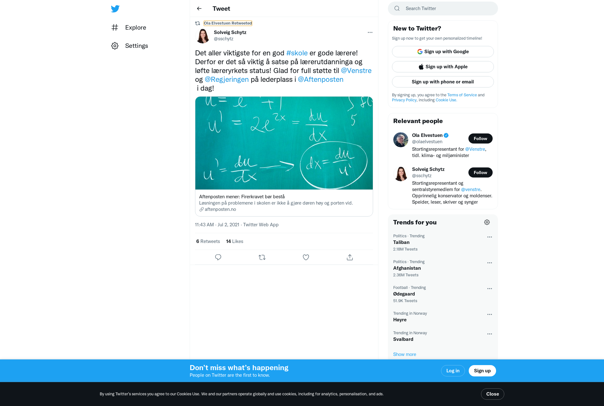 RT @sschytz: Det aller viktigste for en god #skole er gode lærere! Derfor er det så viktig å satse på lærerutdanninga og løfte læreryrkets status! Glad for full støtte til @Venstre og @Regjeringen på lederplass i @Aftenposten