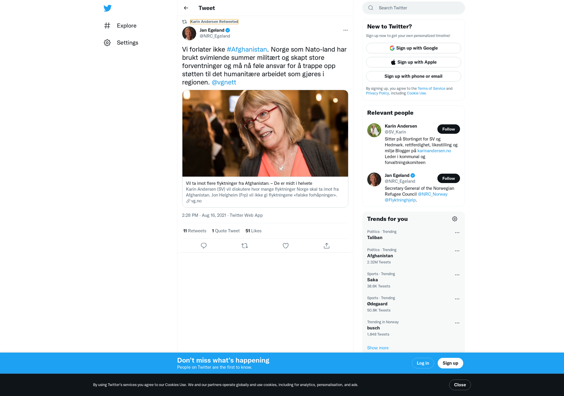 RT @NRC_Egeland: Vi forlater ikke #Afghanistan. Norge som Nato-land har brukt svimlende summer militært og skapt store forventninger og må nå føle ansvar for å trappe opp støtten til det humanitære arbeidet som gjøres i regionen. @vgnett https://t.co/MRzbVOoqE2