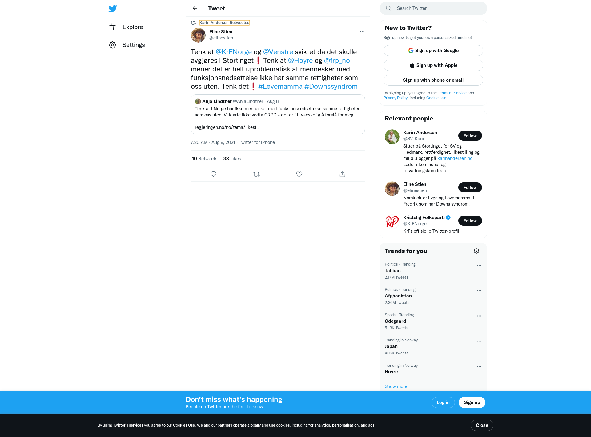 RT @elinestien: Tenk at @KrFNorge og @Venstre sviktet da det skulle avgjøres i Stortinget❗️Tenk at @Hoyre og @frp_no mener det er helt uproblematisk at mennesker med funksjonsnedsettelse ikke har samme rettigheter som oss uten. Tenk det❗️#Løvemamma #Downssyndrom