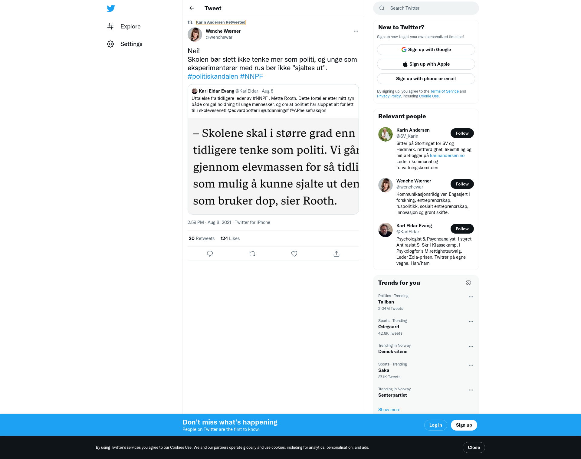 RT @wenchewar: Nei! Skolen bør slett ikke tenke mer som politi, og unge som eksperimenterer med rus bør ikke "sjaltes ut". #politiskandale…