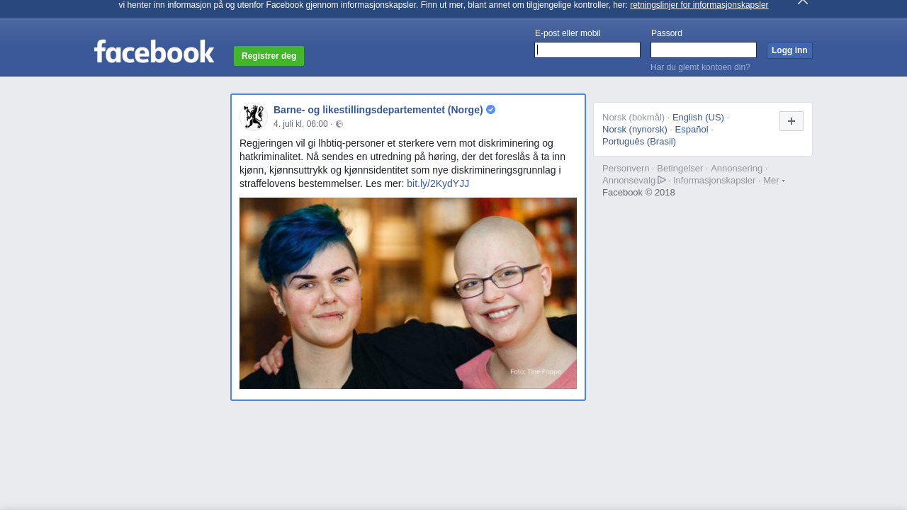 Regjeringen vil gi lhbtiq-personer et sterkere vern mot diskriminering og hatkriminalitet. Nå sendes en utredning på høring, der det foreslås å ta inn kjønn, kjønnsuttrykk og kjønnsidentitet som nye diskrimineringsgrunnlag i straffelovens bestemmelser. Les mer: bit.ly/2KydYJJ