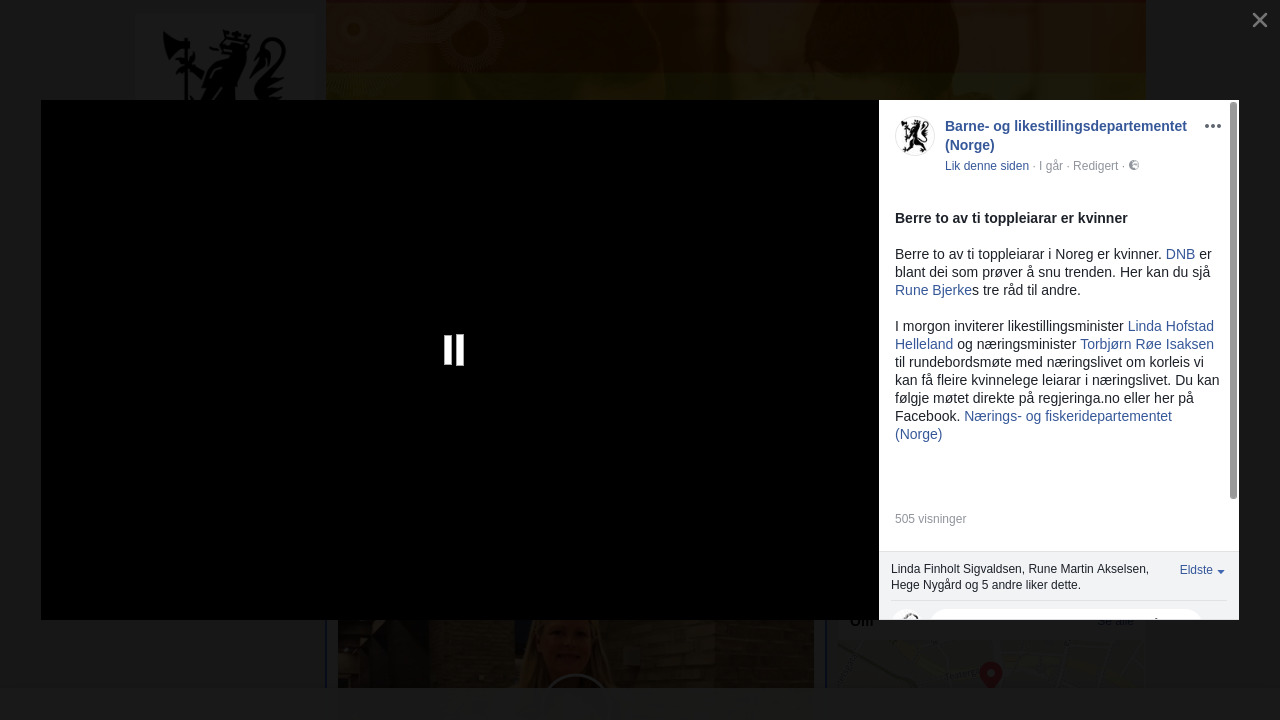 I morgon inviterer likestillingsminister Linda Hofstad Helleland og næringsminister Torbjørn Røe Isaksen til rundebordsmøte med næringslivet om korleis vi kan få fleire kvinnelege leiarar i næringslivet. Du kan følgje møtet direkte på regjeringa.no eller her på Facebook. Nærings- og fiskeridepartementet (Norge)