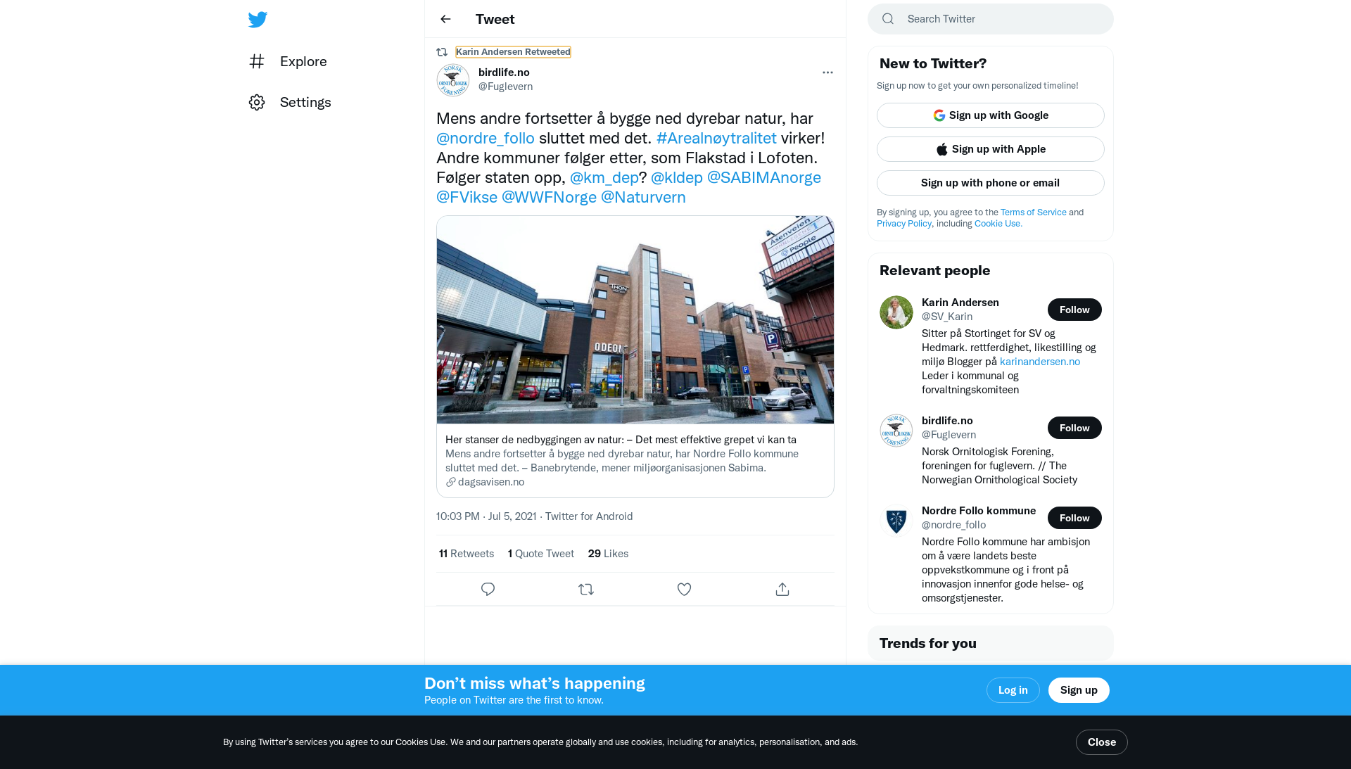 RT @Fuglevern: Mens andre fortsetter å bygge ned dyrebar natur, har @nordre_follo sluttet med det. #Arealnøytralitet virker! Andre kommuner følger etter, som Flakstad i Lofoten. Følger staten opp, @km_dep? @kldep @SABIMAnorge @FVikse @WWFNorge @Naturvern