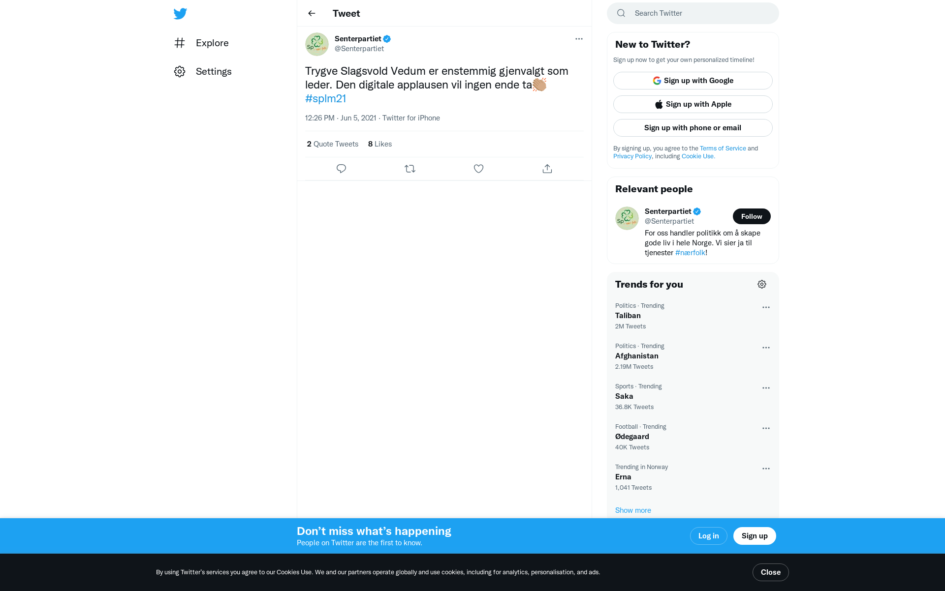 Trygve Slagsvold Vedum er enstemmig gjenvalgt som leder. Den digitale applausen vil ingen ende ta👏🏽 #splm21