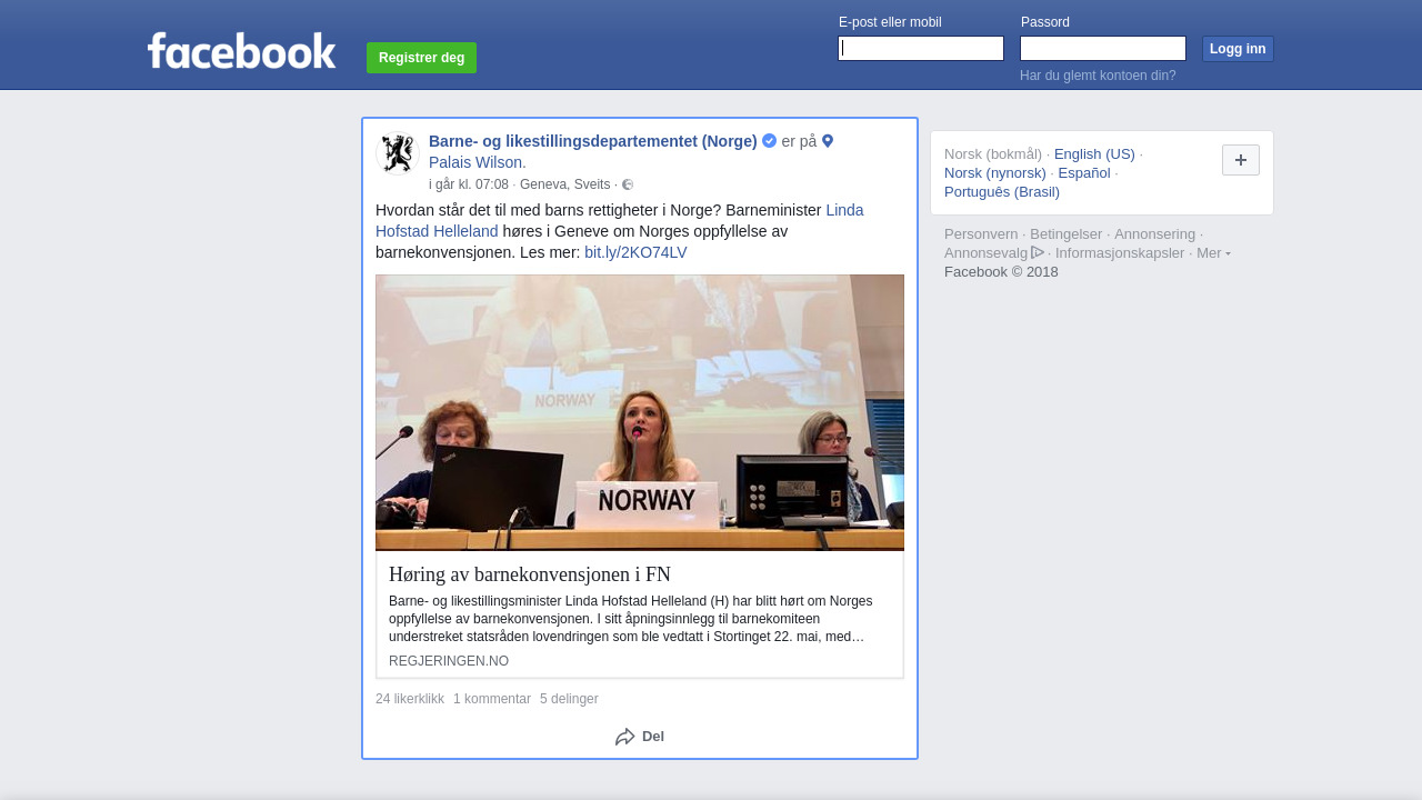 Barne- og likestillingsminister Linda Hofstad Helleland (H) har blitt hørt om Norges oppfyllelse av barnekonvensjonen. I sitt åpningsinnlegg til barnekomiteen understreket statsråden lovendringen som ble vedtatt i Stortinget 22. mai, med 18-årsgrense f...