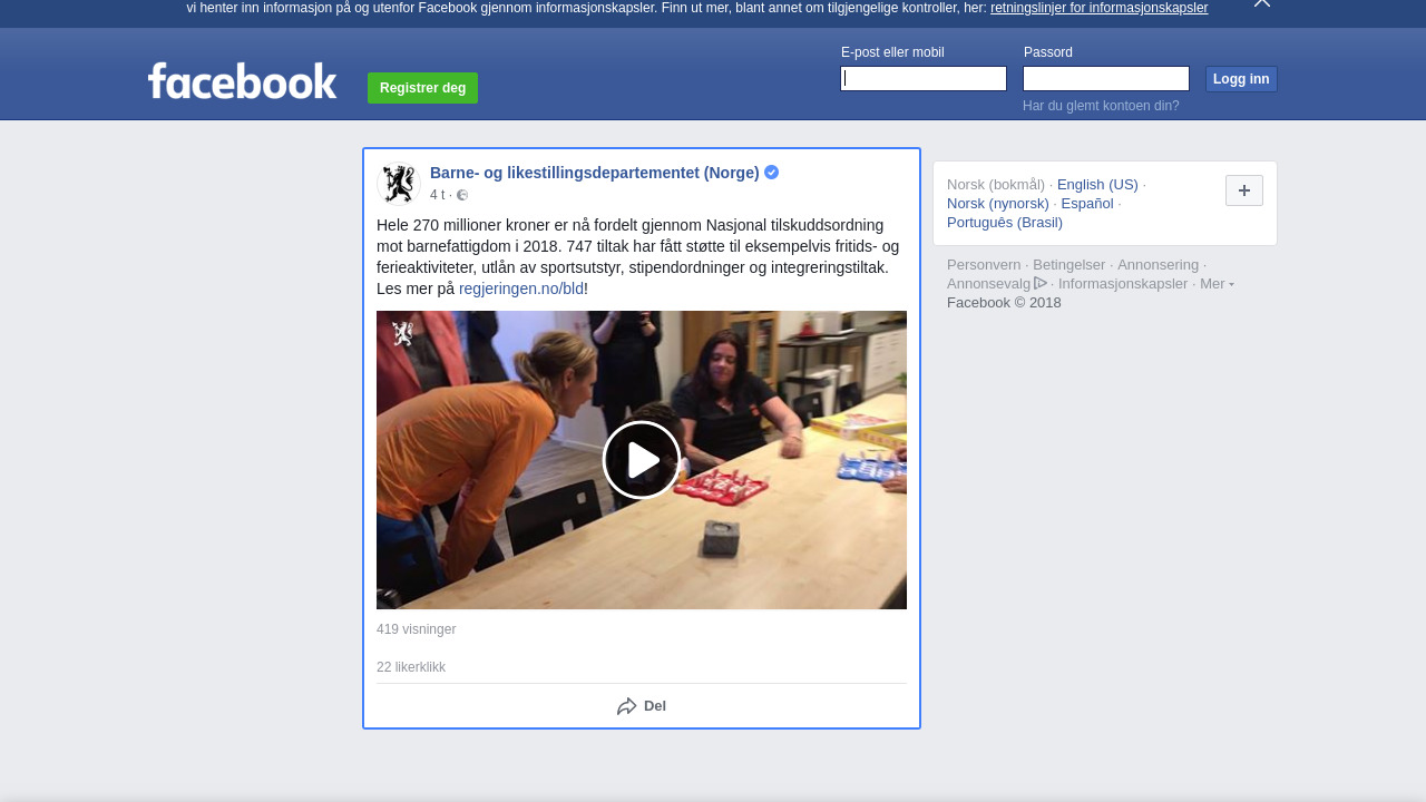 Hele 270 millioner kroner er nå fordelt gjennom Nasjonal tilskuddsordning mot barnefattigdom i 2018. 747 tiltak har fått støtte til eksempelvis fritids- og ferieaktiviteter, utlån av sportsutstyr, stipendordninger og integreringstiltak. Les mer på regjeringen.no/bld!