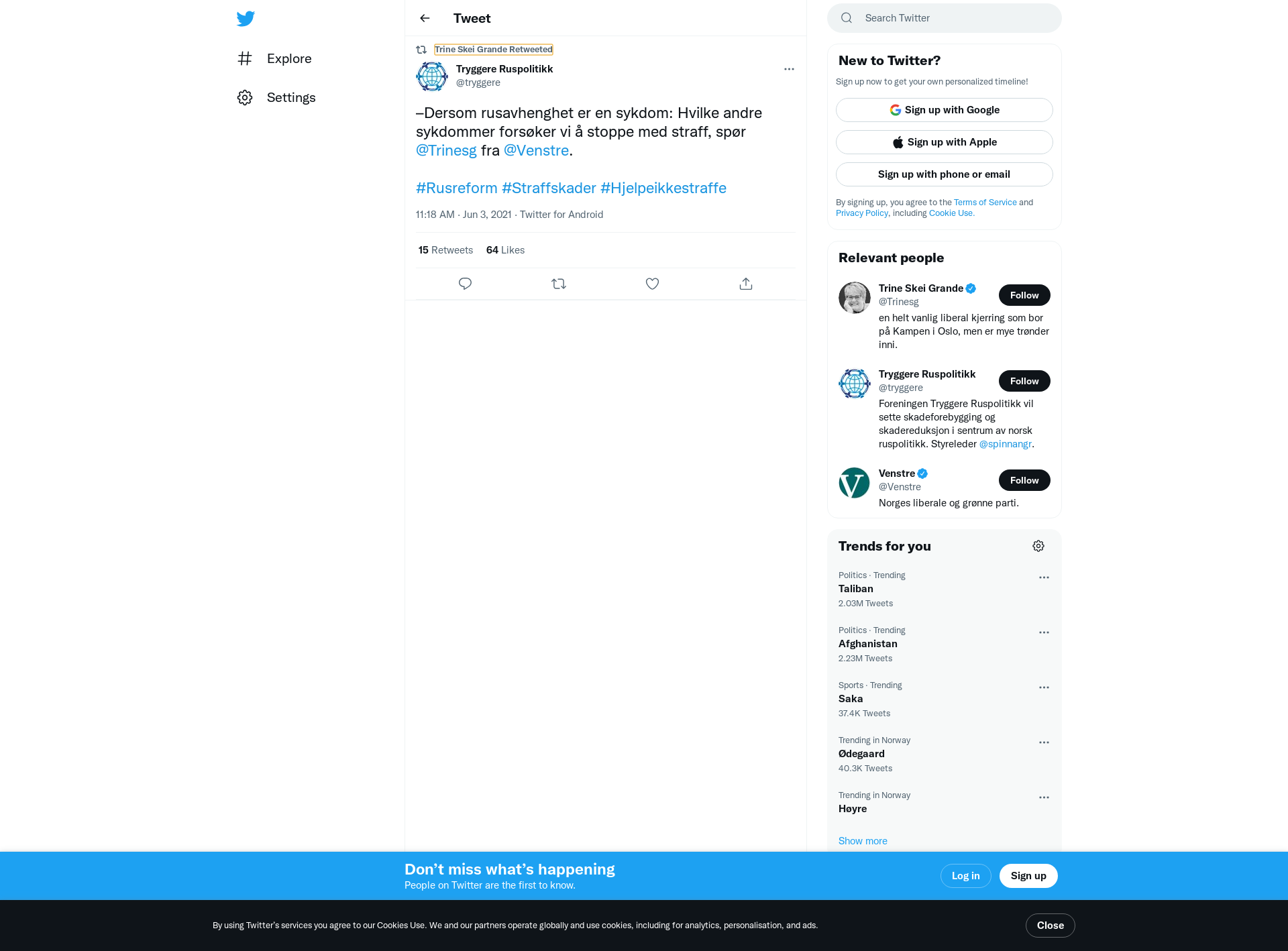 RT @tryggere: –Dersom rusavhenghet er en sykdom: Hvilke andre sykdommer forsøker vi å stoppe med straff, spør @Trinesg fra @Venstre. #Rus…