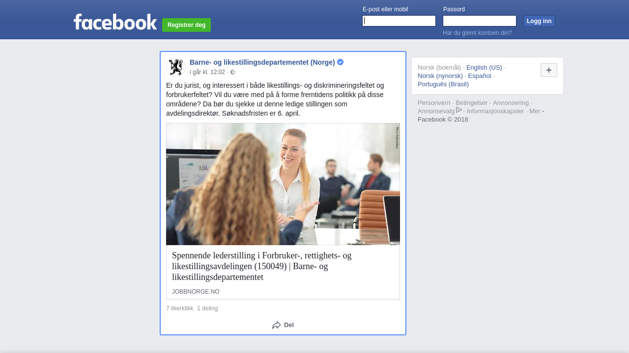 Stillingstittel: Spennende lederstilling i Forbruker-, rettighets- og likestillingsavdelingen (150049), Arbeidsgiver: Barne- og likestillingsdepartementet, Søknadsfrist: 6. april 2018