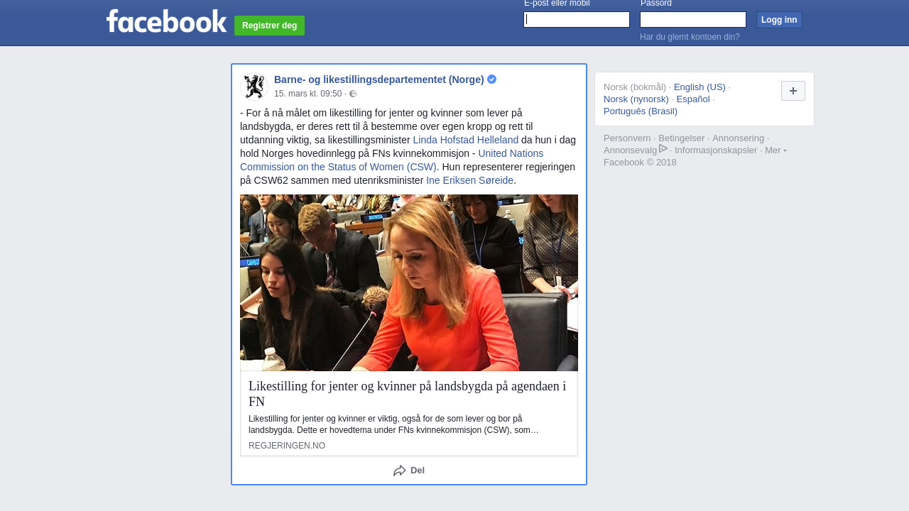 - For å nå målet om likestilling for jenter og kvinner som lever på landsbygda, er deres rett til å bestemme over egen kropp og rett til utdanning viktig, sa likestillingsminister Linda Hofstad Helleland da hun i dag hold Norges hovedinnlegg på FNs kvinnekommisjon - United Nations Commission on the Status of Women (CSW). Hun representerer regjeringen på CSW62 sammen med utenriksminister Ine Eriksen Søreide.