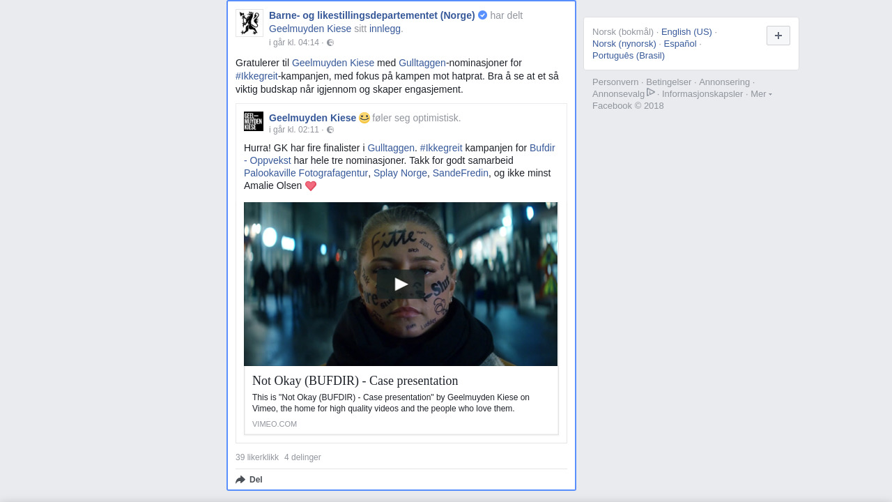 Hurra! GK har fire finalister i Gulltaggen. #Ikkegreit kampanjen for Bufdir - Oppvekst har hele tre nominasjoner. Takk for godt samarbeid Palookaville Fotografagentur, Splay Norge, SandeFredin, og ikke minst Amalie Olsen ❤️