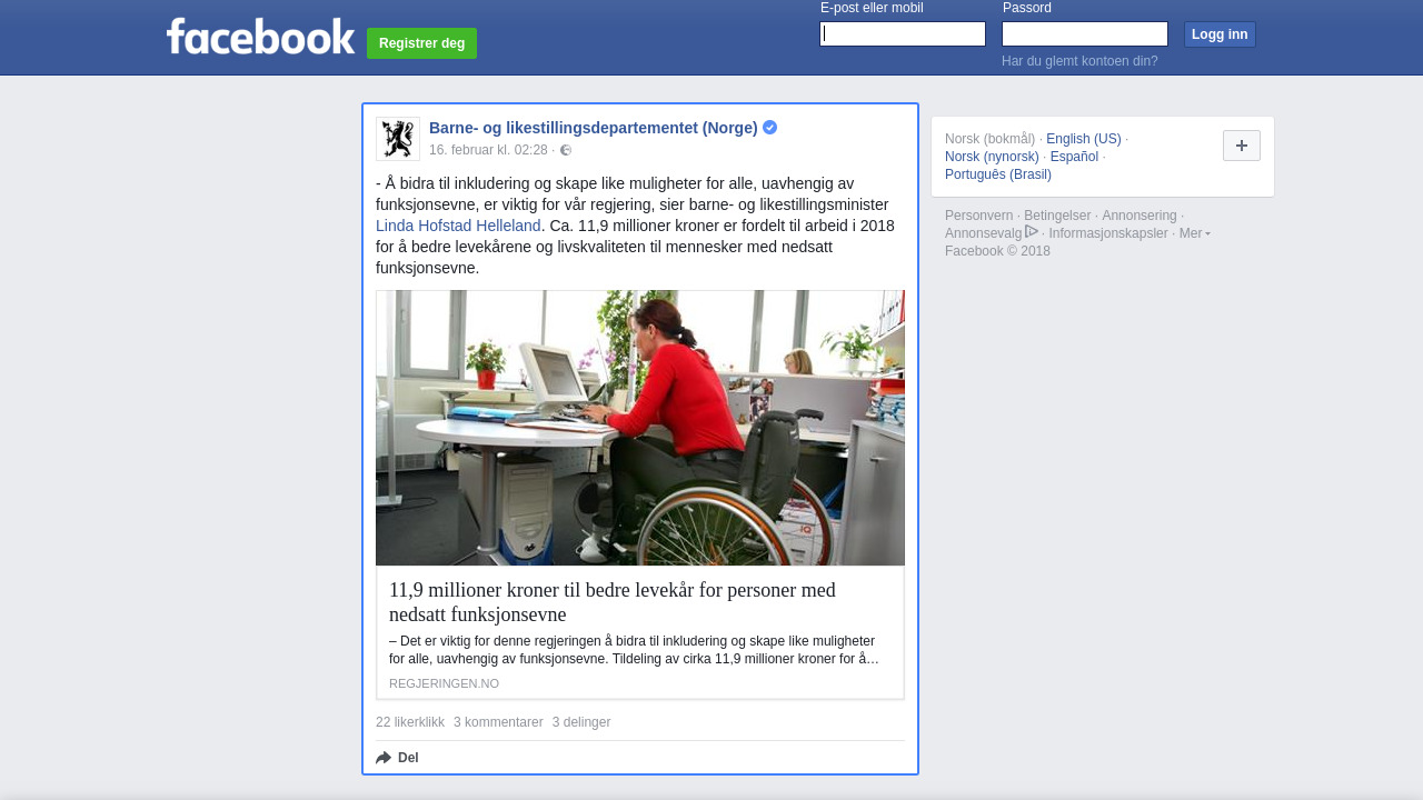 - Å bidra til inkludering og skape like muligheter for alle, uavhengig av funksjonsevne, er viktig for vår regjering, sier barne- og likestillingsminister Linda Hofstad Helleland. Ca. 11,9 millioner kroner er fordelt til arbeid i 2018 for å bedre levekårene og livskvaliteten til mennesker med nedsatt funksjonsevne.