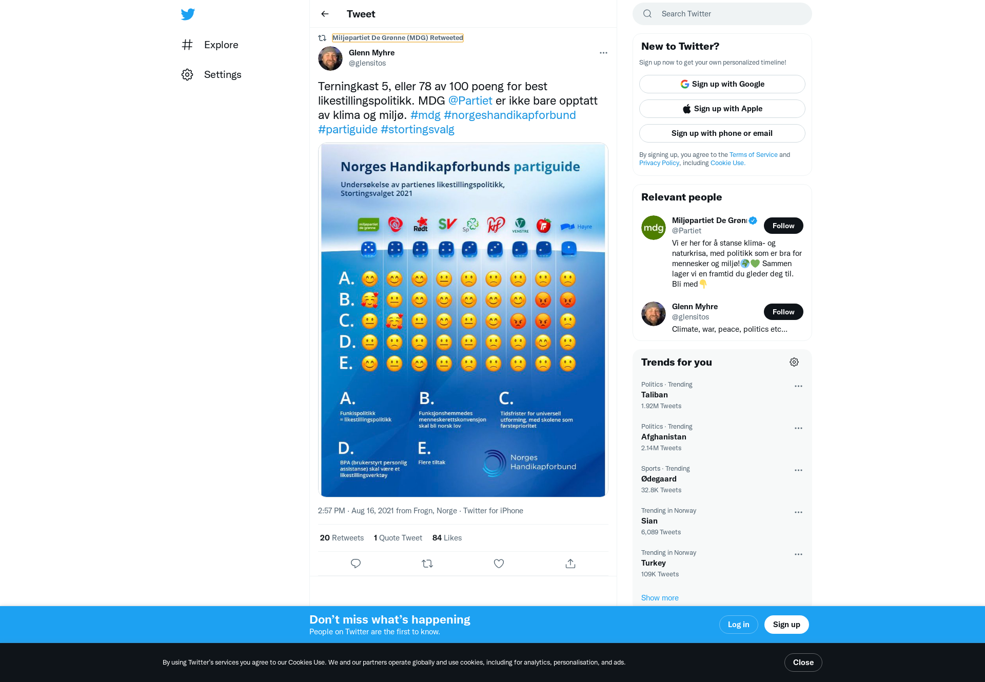 RT @glensitos: Terningkast 5, eller 78 av 100 poeng for best likestillingspolitikk. MDG @Partiet er ikke bare opptatt av klima og miljø. #mdg #norgeshandikapforbund #partiguide #stortingsvalg https://t.co/lozk5PMIL2