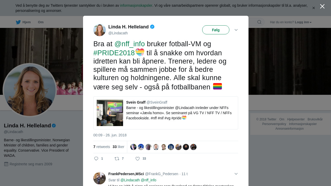 Bra at @nff_info bruker fotball-VM og #PRIDE2018 til å snakke om hvordan idretten kan bli åpnere. Trenere, ledere og spillere må sammen jobbe for å bedre kulturen og holdningene. Alle skal kunne være seg selv - også på fotballbanen 🏳️🌈 https://t.co/g1IyWP0mUQ