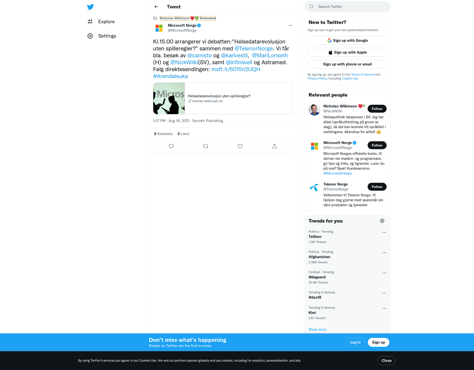 RT @MicrosoftNorge: Kl.15.00 arrangerer vi debatten:"Helsedatarevolusjon uten spilleregler?" sammen med @TelenorNorge. Vi får bla. besøk av @camisto og @karlvestli, @MariLonseth(H) og @NickWilki(SV), samt @infiniwell og Astramed. Følg direktesendingen: https://t.co/pISkKJR7V0 #Arendalsuka