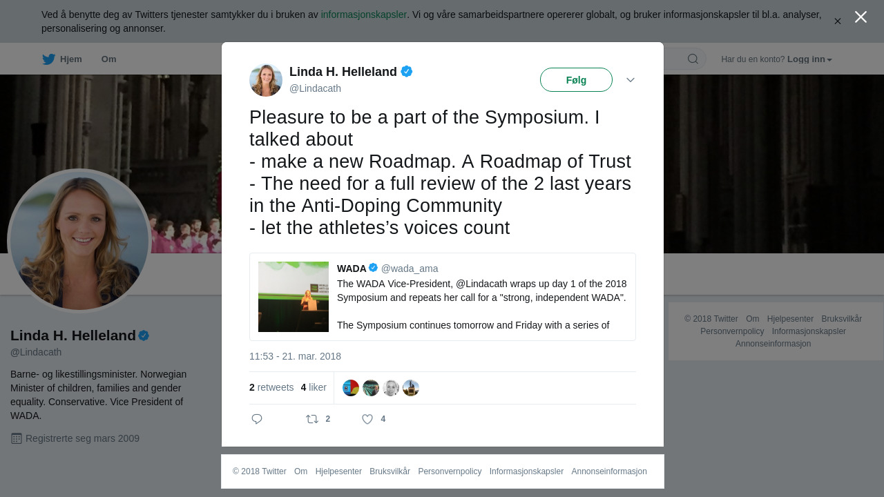 “The WADA Vice-President, @Lindacath wraps up day 1 of the 2018 Symposium and repeats her call for a "strong, independent WADA". The Symposium continues tomorrow and Friday with a series of workshop sessions tailored for ADOs and other key stakeholders.”