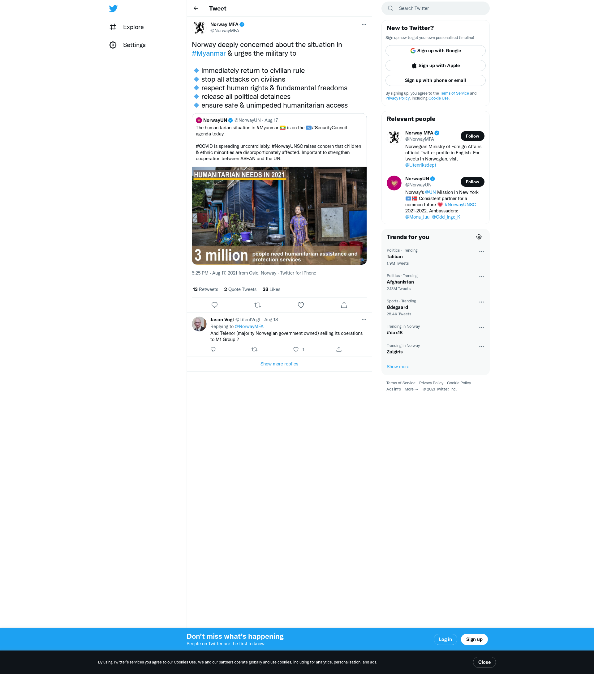 Norway deeply concerned about the situation in #Myanmar & urges the military to