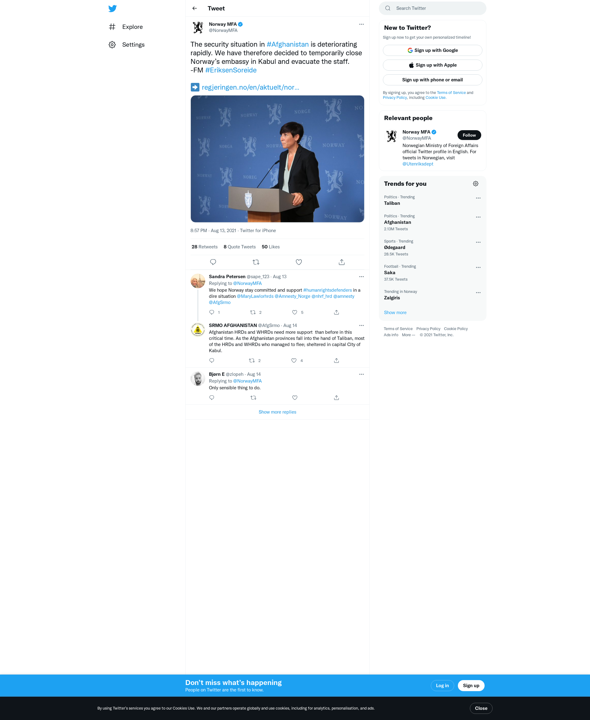 ‘The security situation in Afghanistan is deteriorating rapidly and this is having a severe impact on the civilian population. We have therefore decided to temporarily close the Norwegian Embassy in Kabul and evacuate the staff. Responsibility for the ...