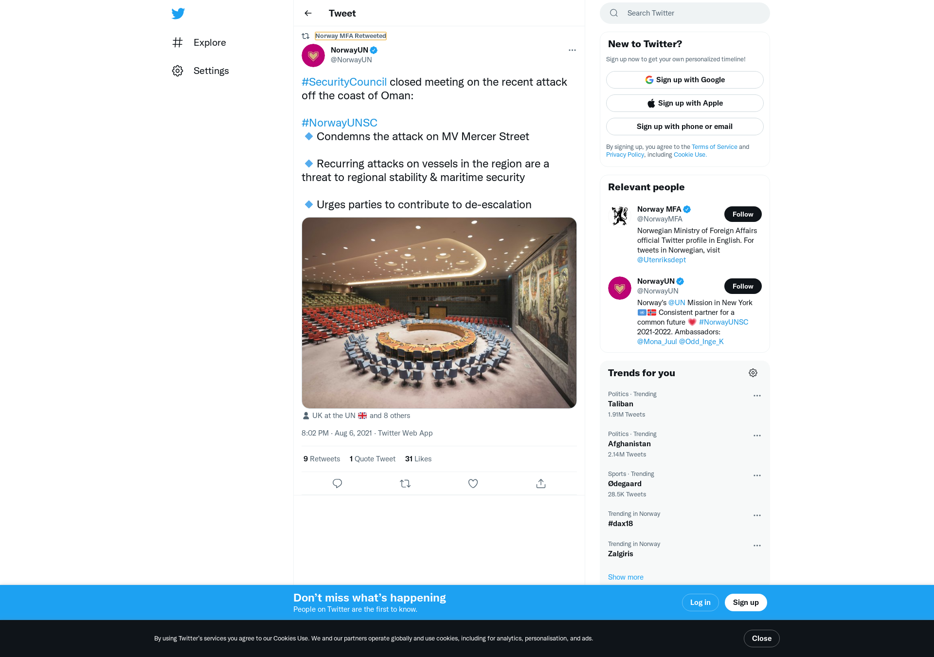 RT @NorwayUN: #SecurityCouncil closed meeting on the recent attack off the coast of Oman: #NorwayUNSC 🔹Condemns the attack on MV Mercer St…