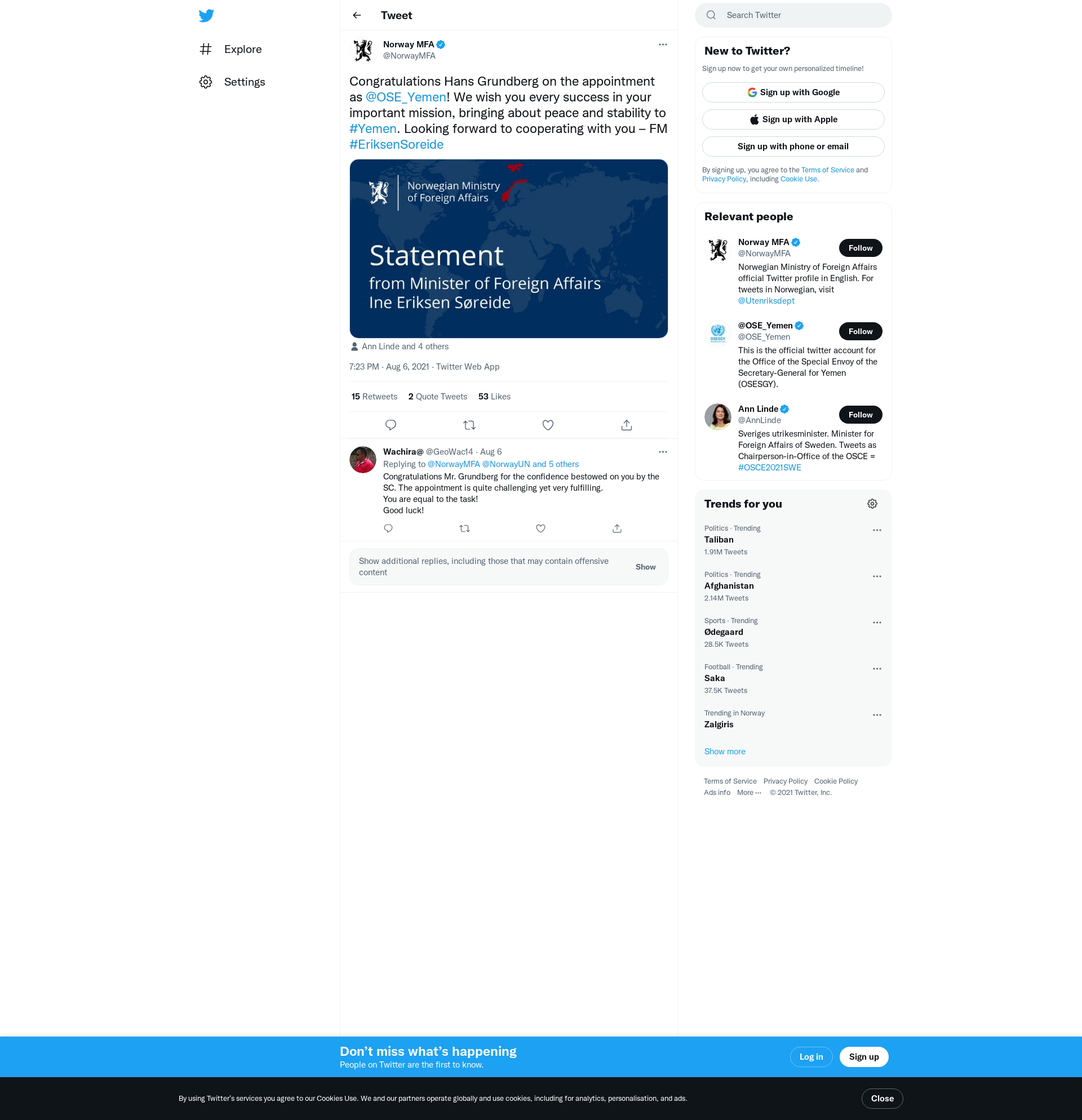 Congratulations Hans Grundberg on the appointment as @OSE_Yemen! We wish you every success in your important mission, bringing about peace and stability to #Yemen. Looking forward to cooperating with you – FM #EriksenSoreide https://t.co/eAIomMy19P