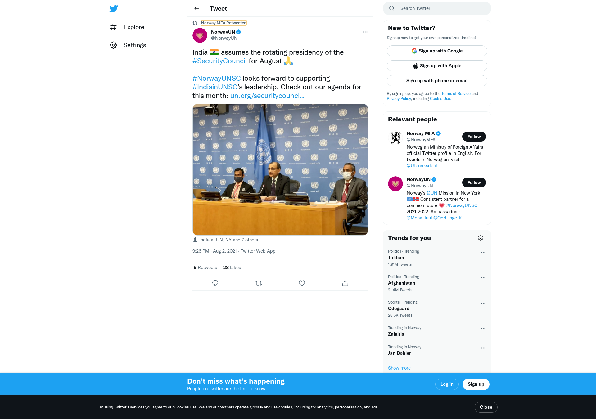 RT @NorwayUN: India 🇮🇳 assumes the rotating presidency of the #SecurityCouncil for August 🙏 #NorwayUNSC looks forward to supporting #India…