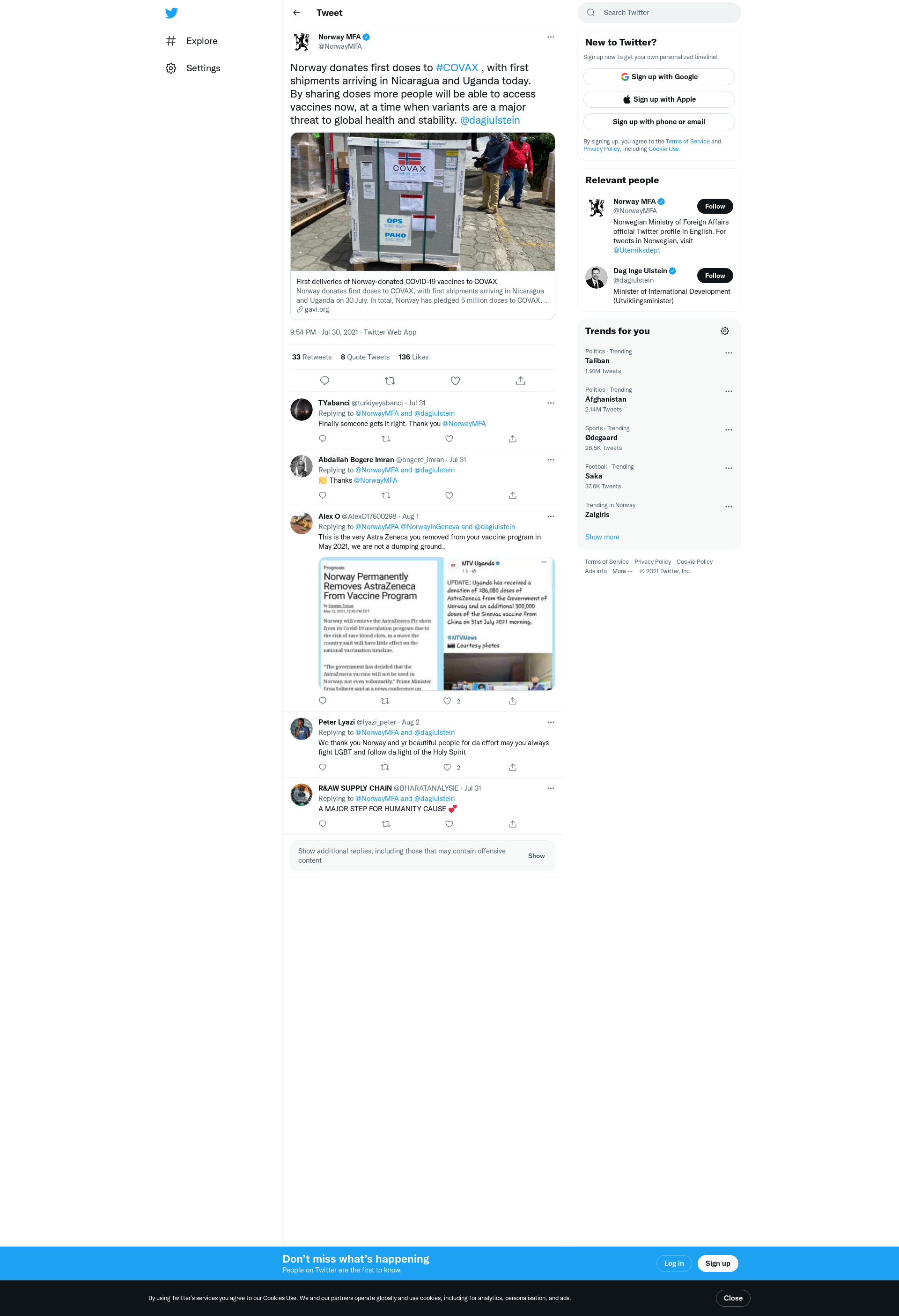 Norway donates first doses to COVAX, with first shipments arriving in Nicaragua and Uganda on 30 July. In total, Norway has pledged 5 million doses to COVAX, as well as US$ 141 million in funding.