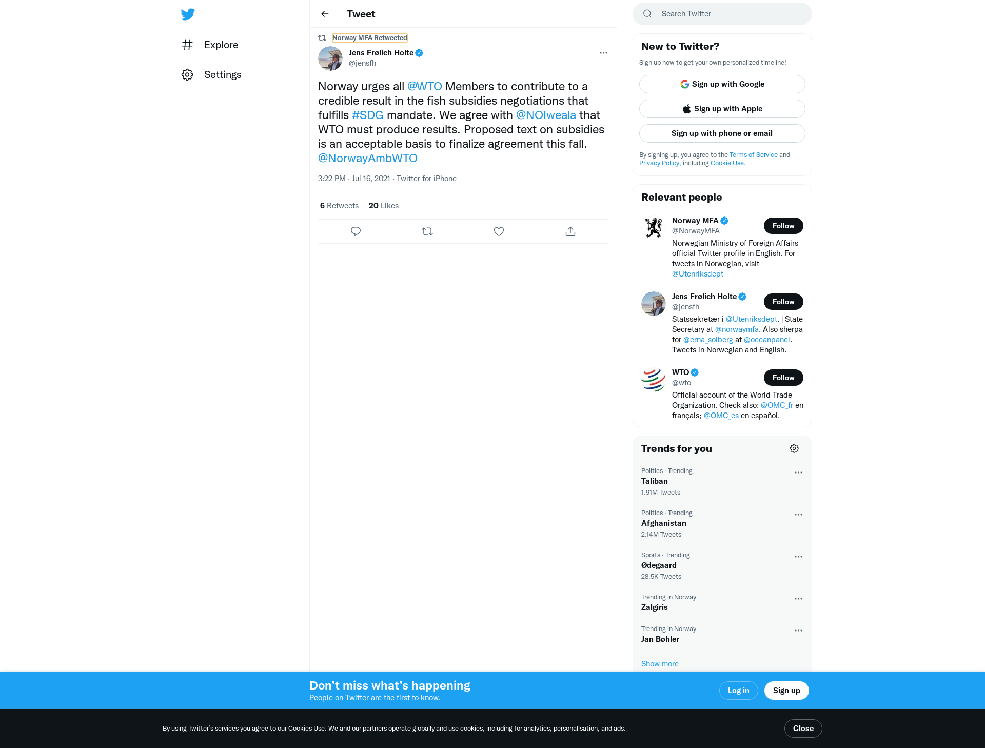 RT @jensfh: Norway urges all @WTO Members to contribute to a credible result in the fish subsidies negotiations that fulfills #SDG mandate. We agree with @NOIweala that WTO must produce results. Proposed text on subsidies is an acceptable basis to finalize agreement this fall. @NorwayAmbWTO