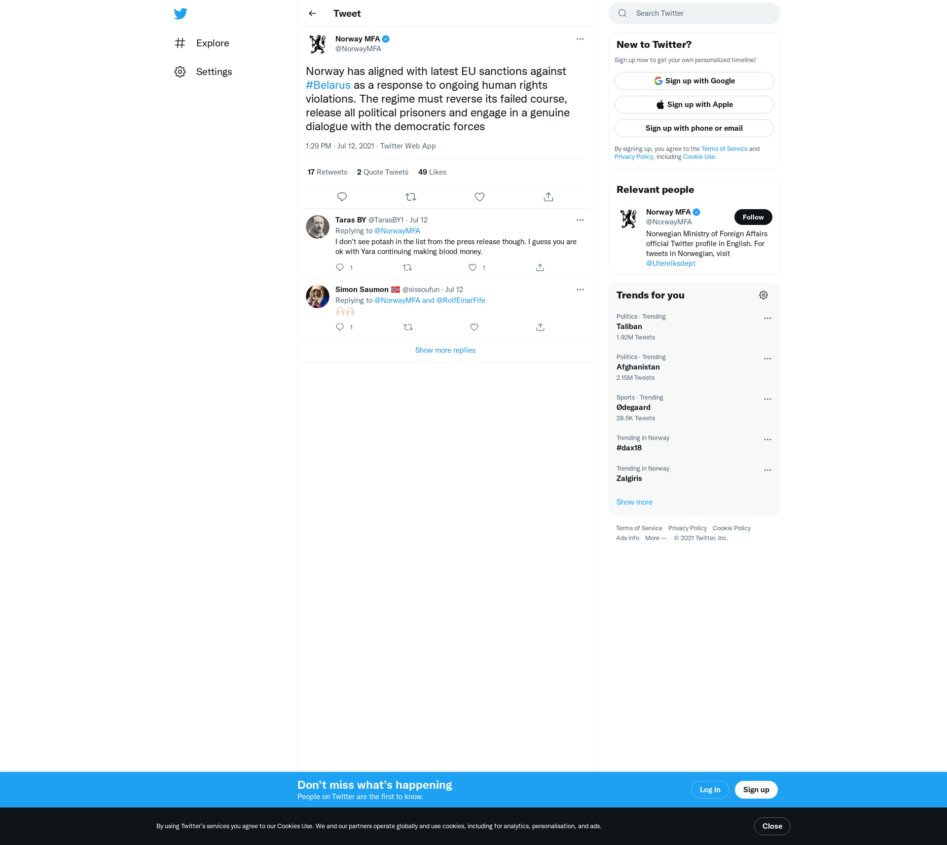 Norway has aligned with latest EU sanctions against #Belarus as a response to ongoing human rights violations. The regime must reverse its failed course, release all political prisoners and engage in a genuine dialogue with the democratic forces