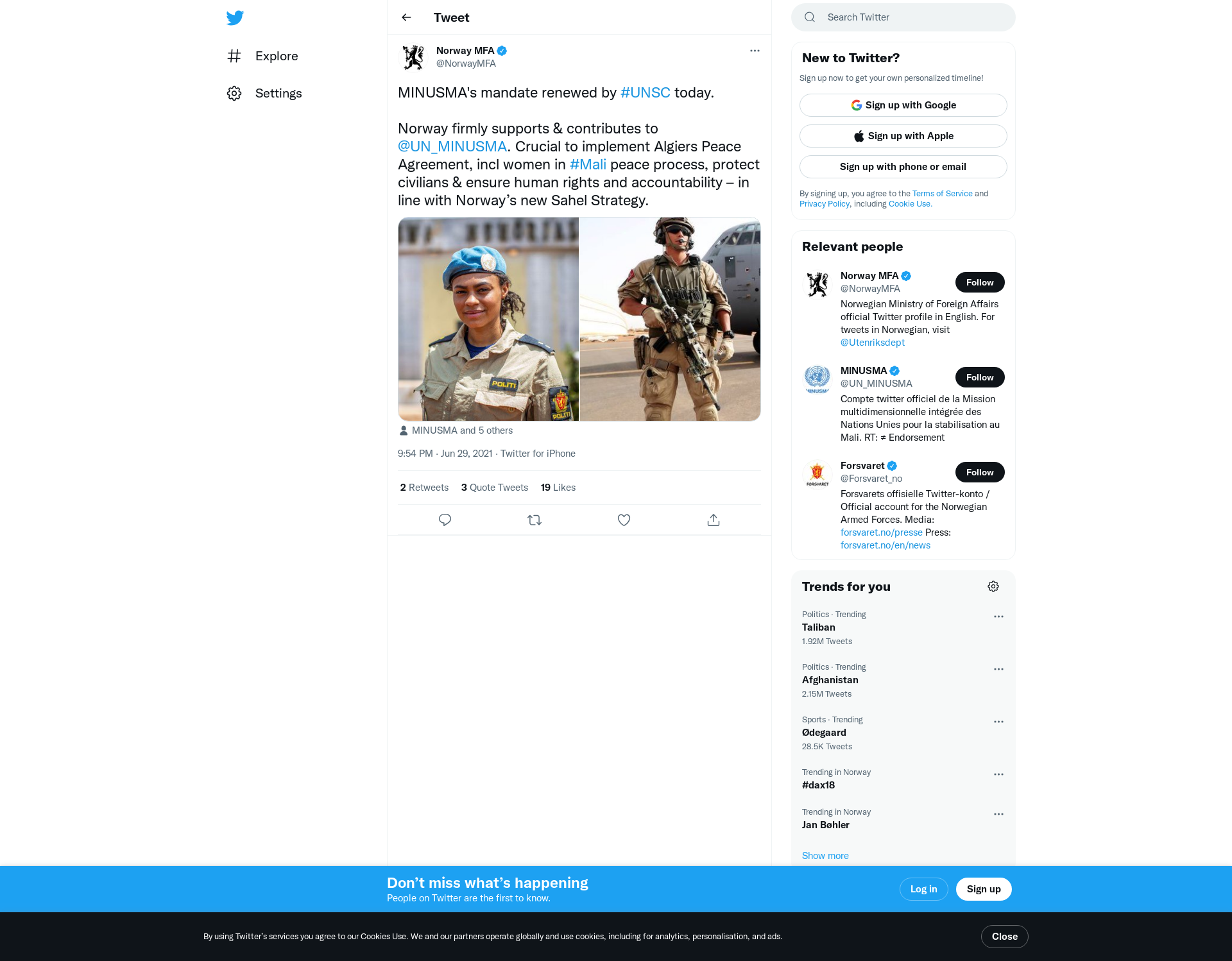 Norway firmly supports & contributes to @UN_MINUSMA. Crucial to implement Algiers Peace Agreement, incl women in #Mali peace process, protect civilians & ensure human rights and accountability – in line with Norway’s new Sahel Strategy. https://t.co/u1joY9teF4
