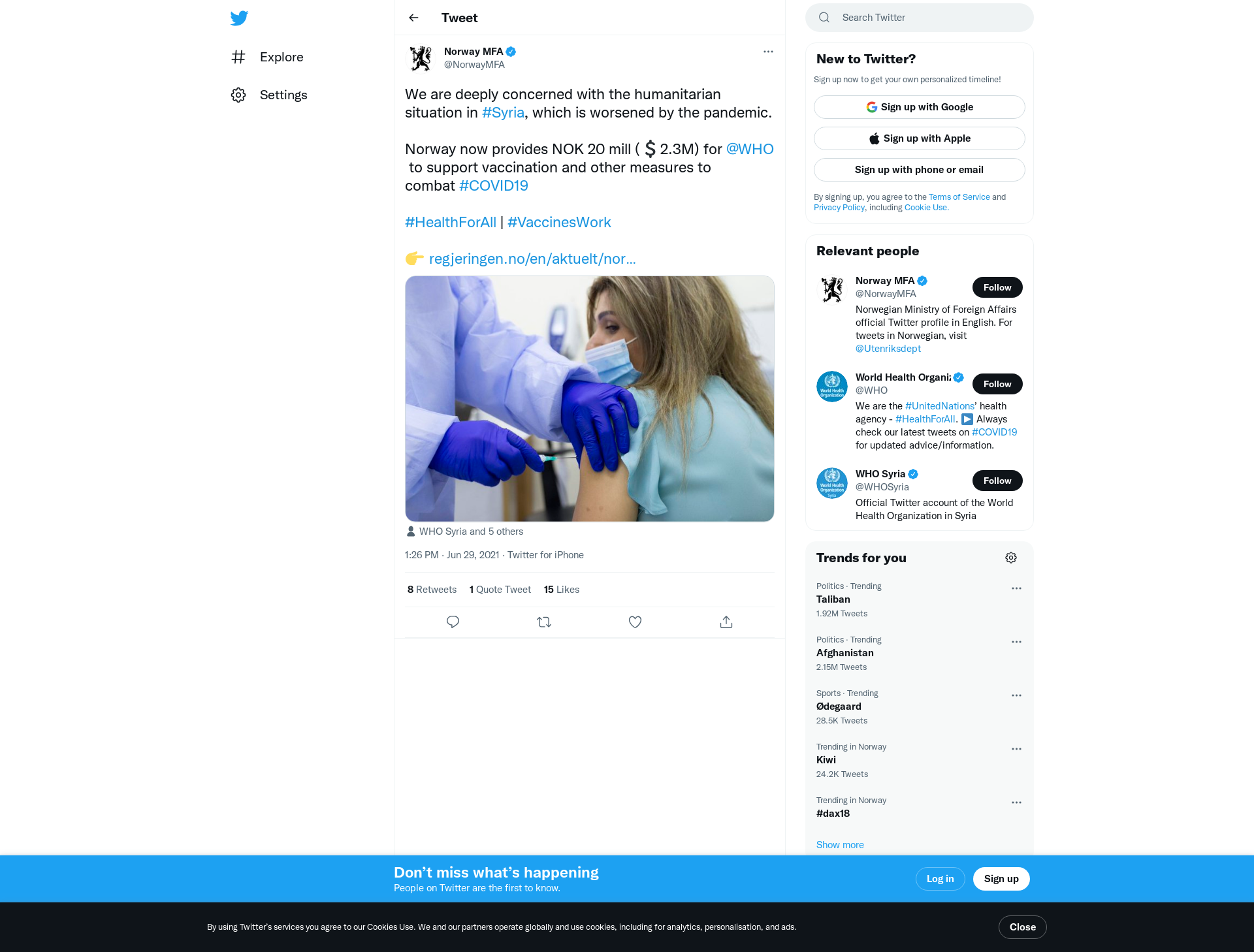 ‘Norway remains deeply concerned about the humanitarian situation in Syria, which has further deteriorated during the COVID-19 pandemic. That is why Norway is now providing NOK 20 million to the World Health Organization to support vaccination efforts ...