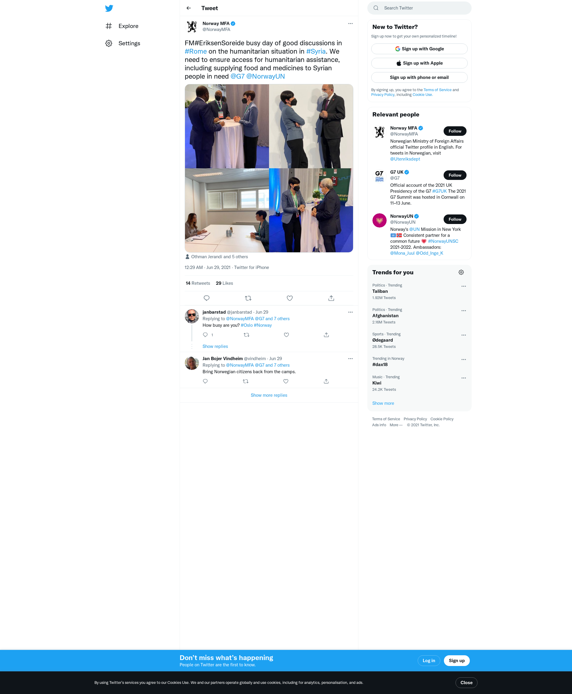 FM#EriksenSoreide busy day of good discussions in #Rome on the humanitarian situation in #Syria. We need to ensure access for humanitarian assistance, including supplying food and medicines to Syrian people in need @G7 @NorwayUN https://t.co/9ImNV6b9HQ