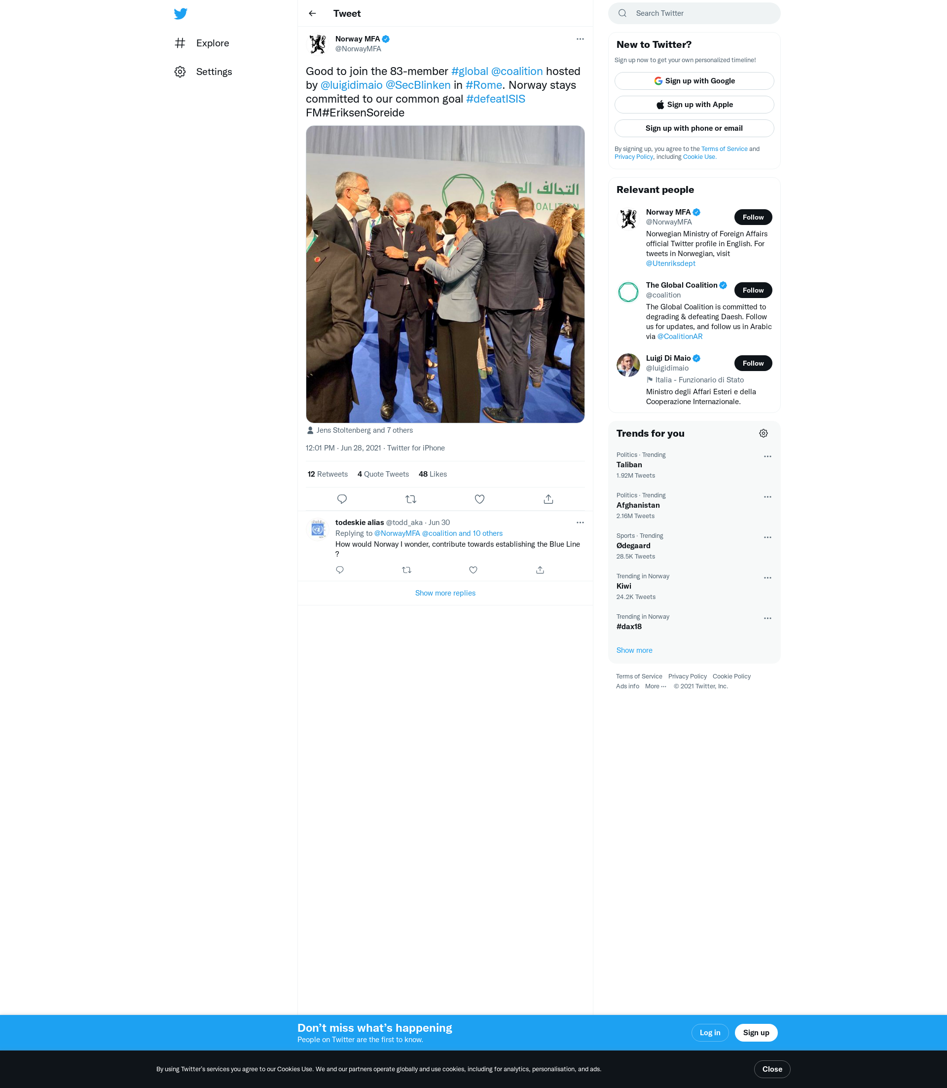 Good to join the 83-member #global @coalition hosted by @luigidimaio @SecBlinken in #Rome. Norway stays committed to our common goal #defeatISIS FM#EriksenSoreide https://t.co/IIK4l6fydo