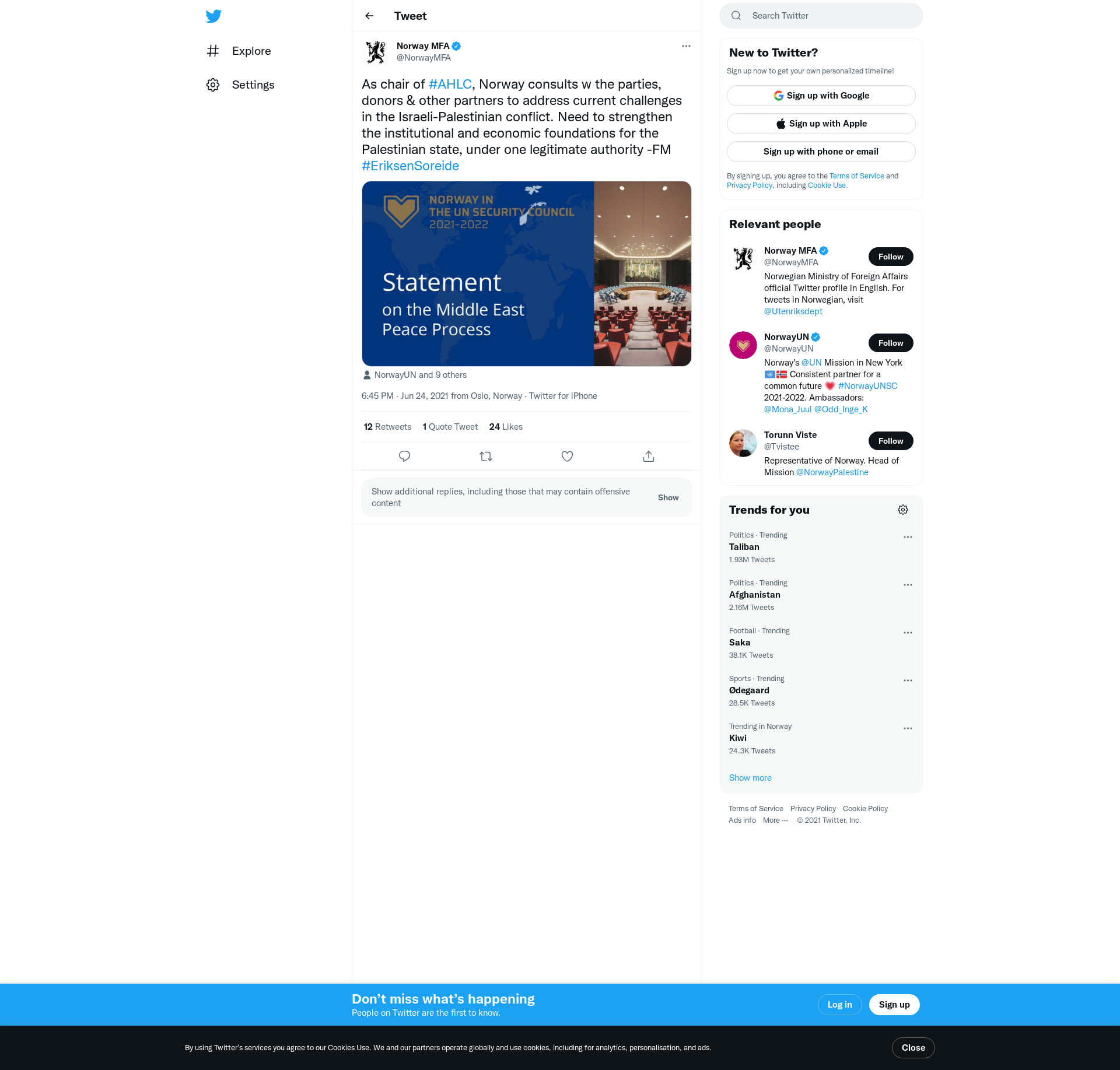 As chair of #AHLC, Norway consults w the parties, donors & other partners to address current challenges in the Israeli-Palestinian conflict. Need to strengthen the institutional and economic foundations for the Palestinian state, under one legitimate authority -FM #EriksenSoreide https://t.co/Y6d81SbOkm