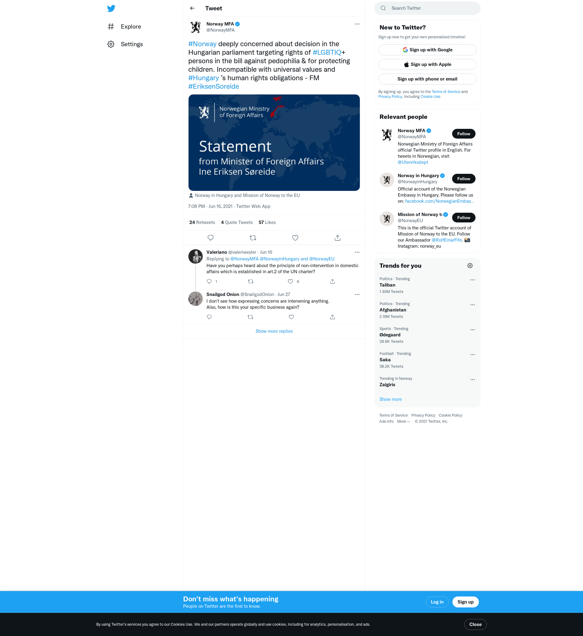 #Norway deeply concerned about decision in the Hungarian parliament targeting rights of #LGBTIQ+ persons in the bill against pedophilia & for protecting children. Incompatible with universal values and #Hungary ’s human rights obligations - FM #EriksenSoreide https://t.co/O906QYyc3A