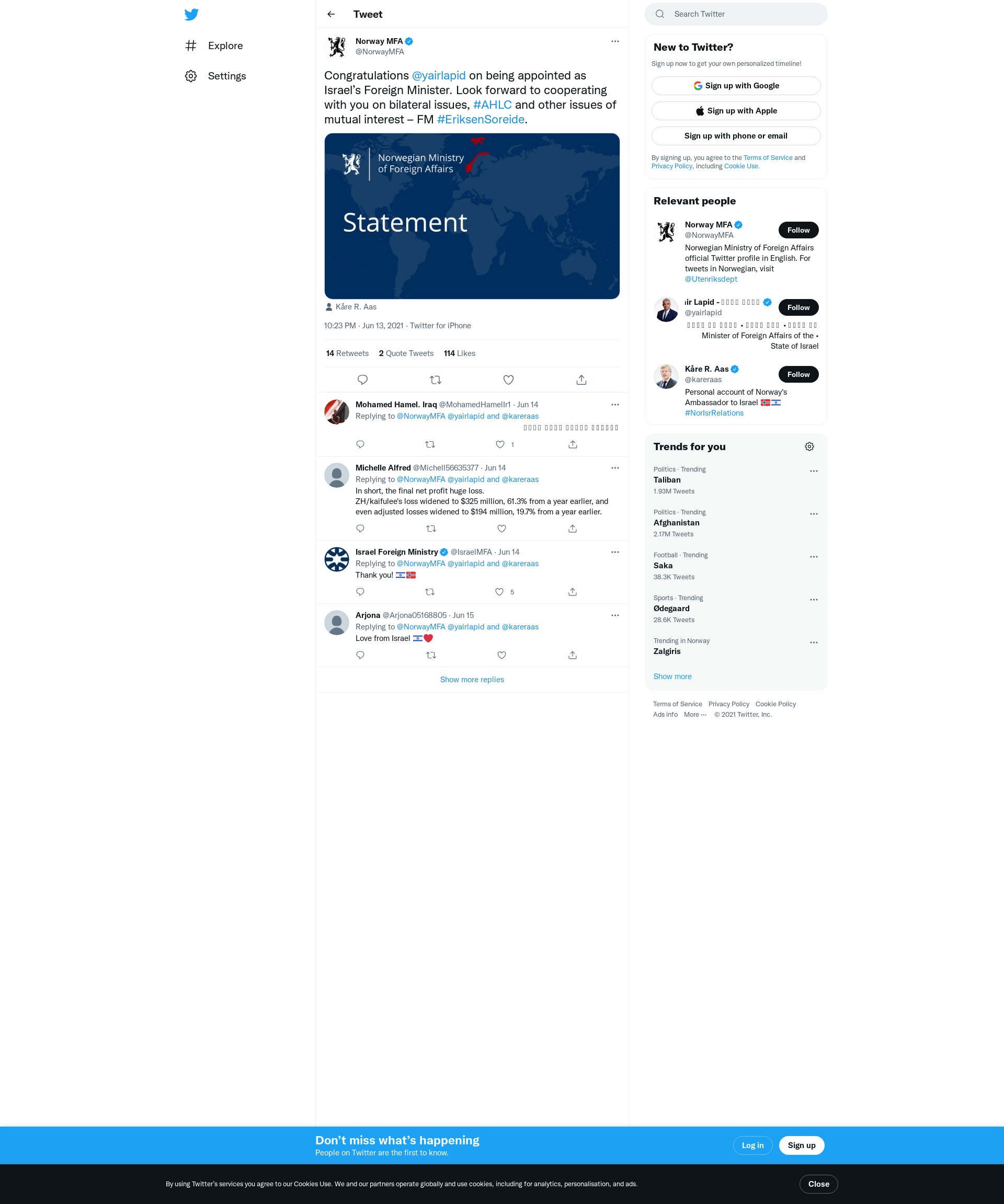 Congratulations @yairlapid on being appointed as Israel’s Foreign Minister. Look forward to cooperating with you on bilateral issues, #AHLC and other issues of mutual interest – FM #EriksenSoreide. https://t.co/pPPjrnIcaj
