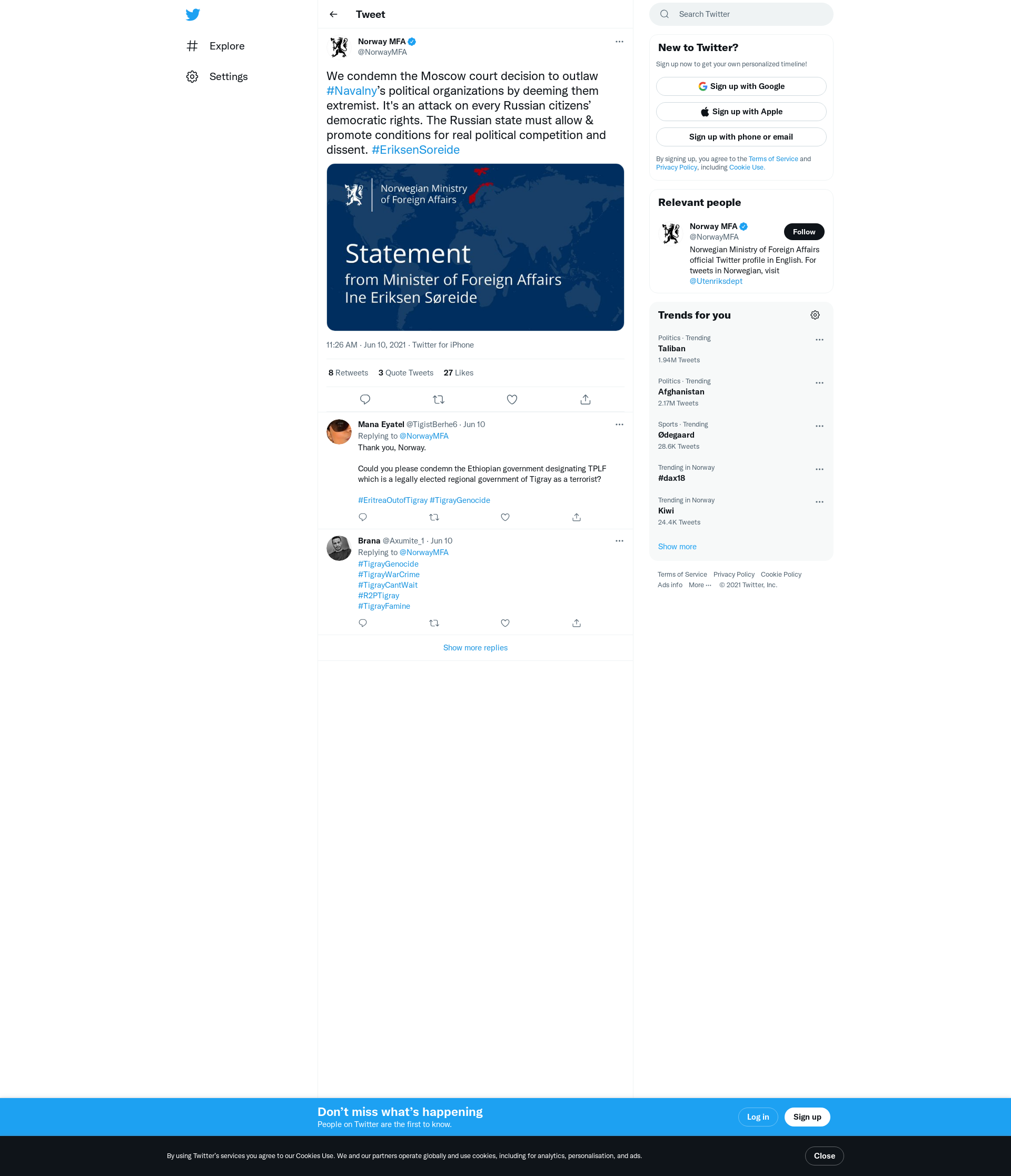 We condemn the Moscow court decision to outlaw #Navalny’s political organizations by deeming them extremist. It's an attack on every Russian citizens’ democratic rights. The Russian state must allow & promote conditions for real political competition and dissent. #EriksenSoreide https://t.co/05gTWdfYBC