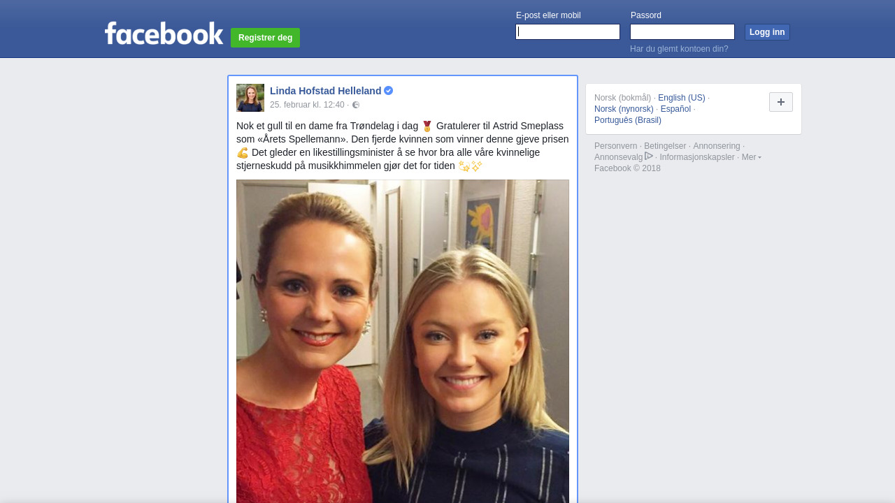 Nok et gull til en dame fra Trøndelag i dag 🥇 Gratulerer til Astrid Smeplass som «Årets Spellemann». Den fjerde kvinnen som vinner denne gjeve prisen💪 Det gleder en likestillingsminister å se hvor bra alle våre kvinnelige stjerneskudd på musikkhimmelen gjør det for tiden 💫✨