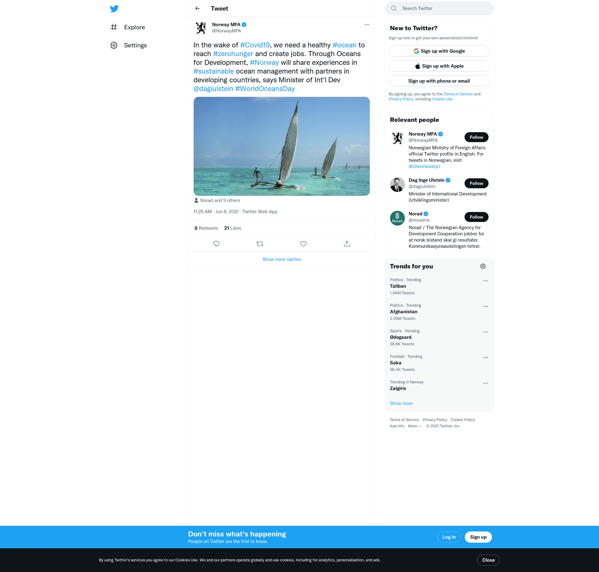 In the wake of #Covid19, we need a healthy #ocean to reach #zerohunger and create jobs. Through Oceans for Development, #Norway will share experiences in #sustainable ocean management with partners in developing countries, says Minister of Int'l Dev @dagiulstein #WorldOceansDay https://t.co/0dl9ELNOhE