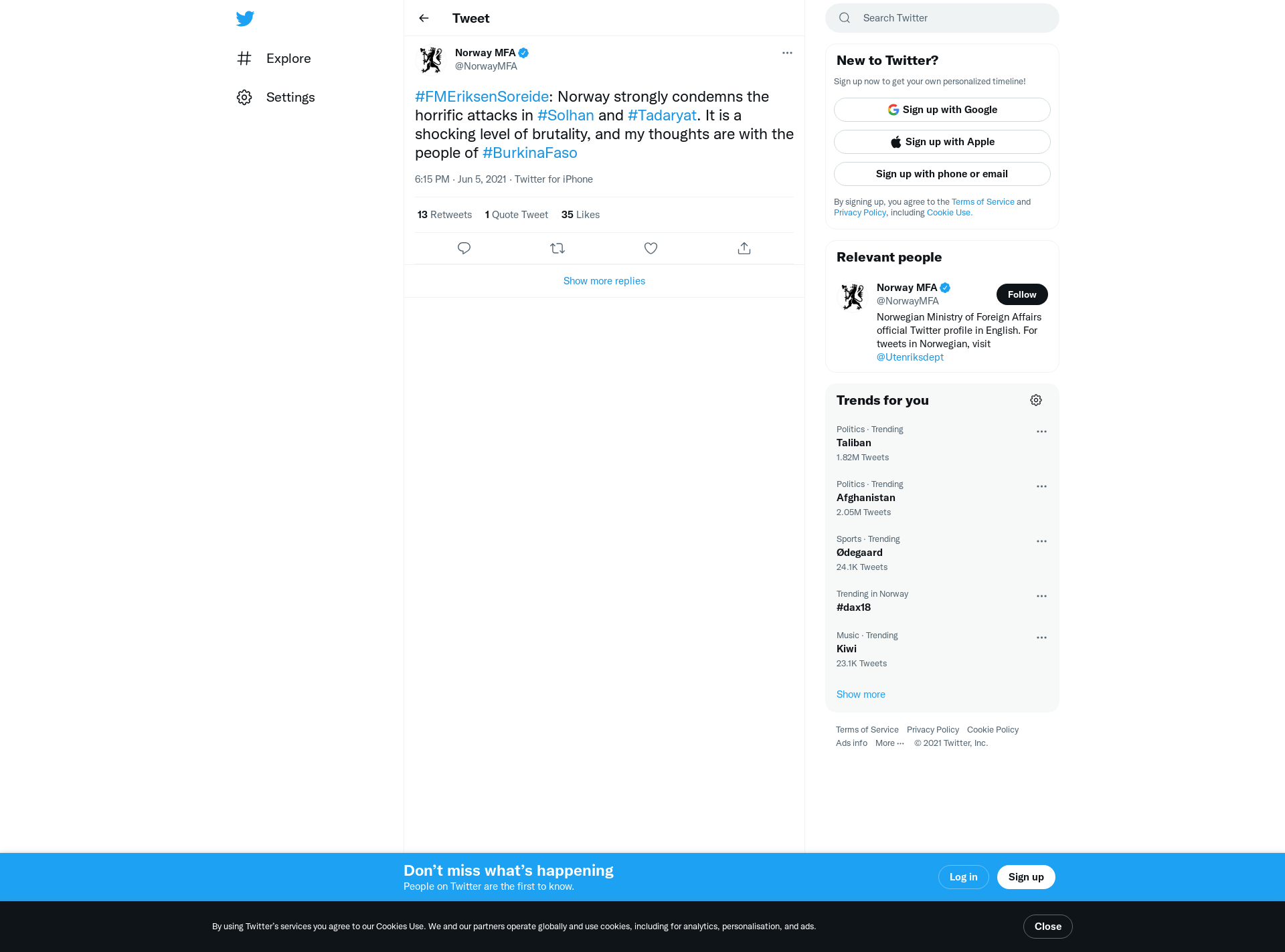 #FMEriksenSoreide: Norway strongly condemns the horrific attacks in #Solhan and #Tadaryat. It is a shocking level of brutality, and my thoughts are with the people of #BurkinaFaso