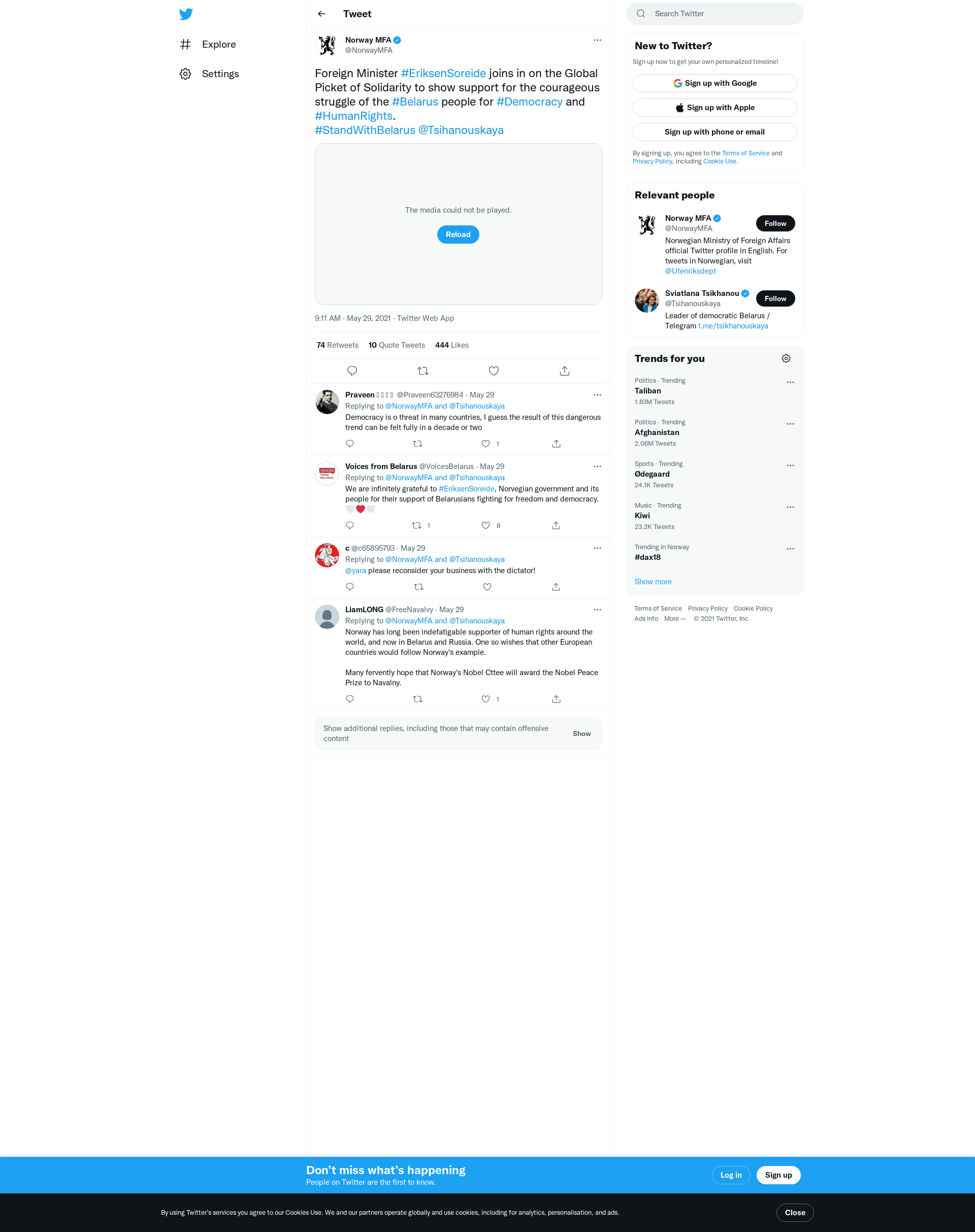 Foreign Minister #EriksenSoreide joins in on the Global Picket of Solidarity to show support for the courageous struggle of the #Belarus people for #Democracy and #HumanRights.