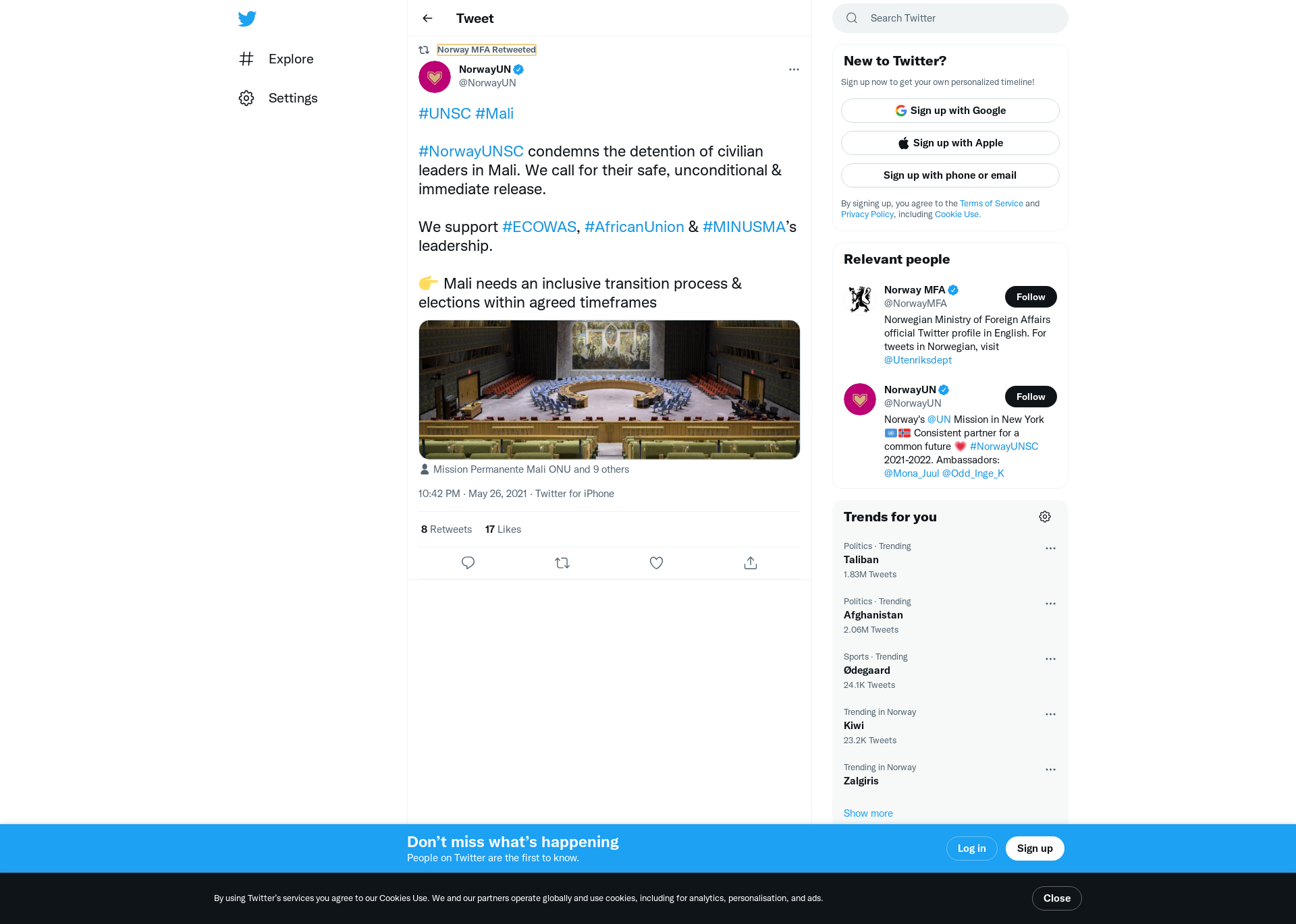 RT @NorwayUN: #UNSC #Mali #NorwayUNSC condemns the detention of civilian leaders in Mali. We call for their safe, unconditional & immediat…