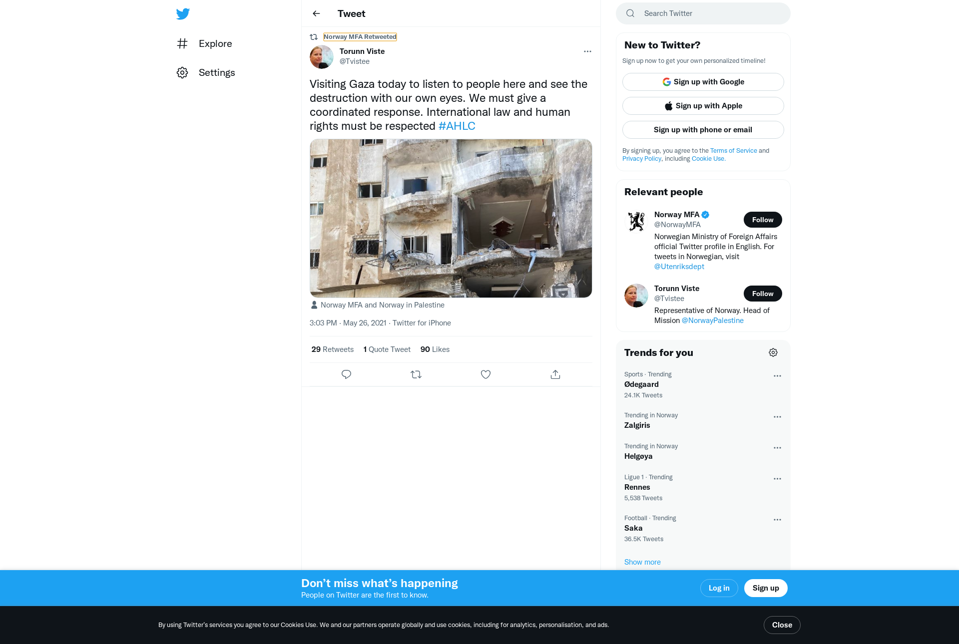 RT @Tvistee: Visiting Gaza today to listen to people here and see the destruction with our own eyes. We must give a coordinated response. International law and human rights must be respected #AHLC https://t.co/pc9tFVfaML