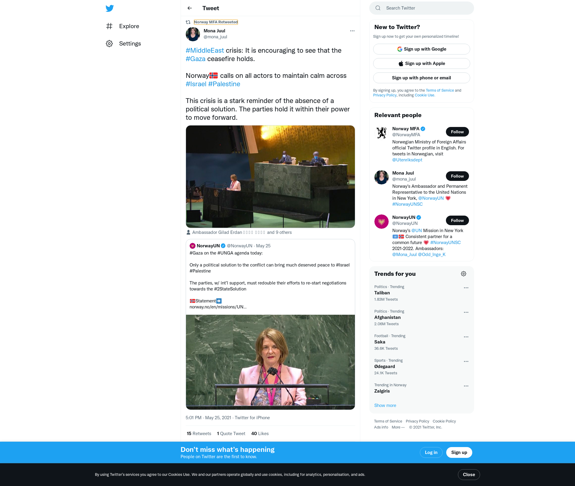 RT @mona_juul: #MiddleEast crisis: It is encouraging to see that the #Gaza ceasefire holds. Norway🇳🇴 calls on all actors to maintain calm…