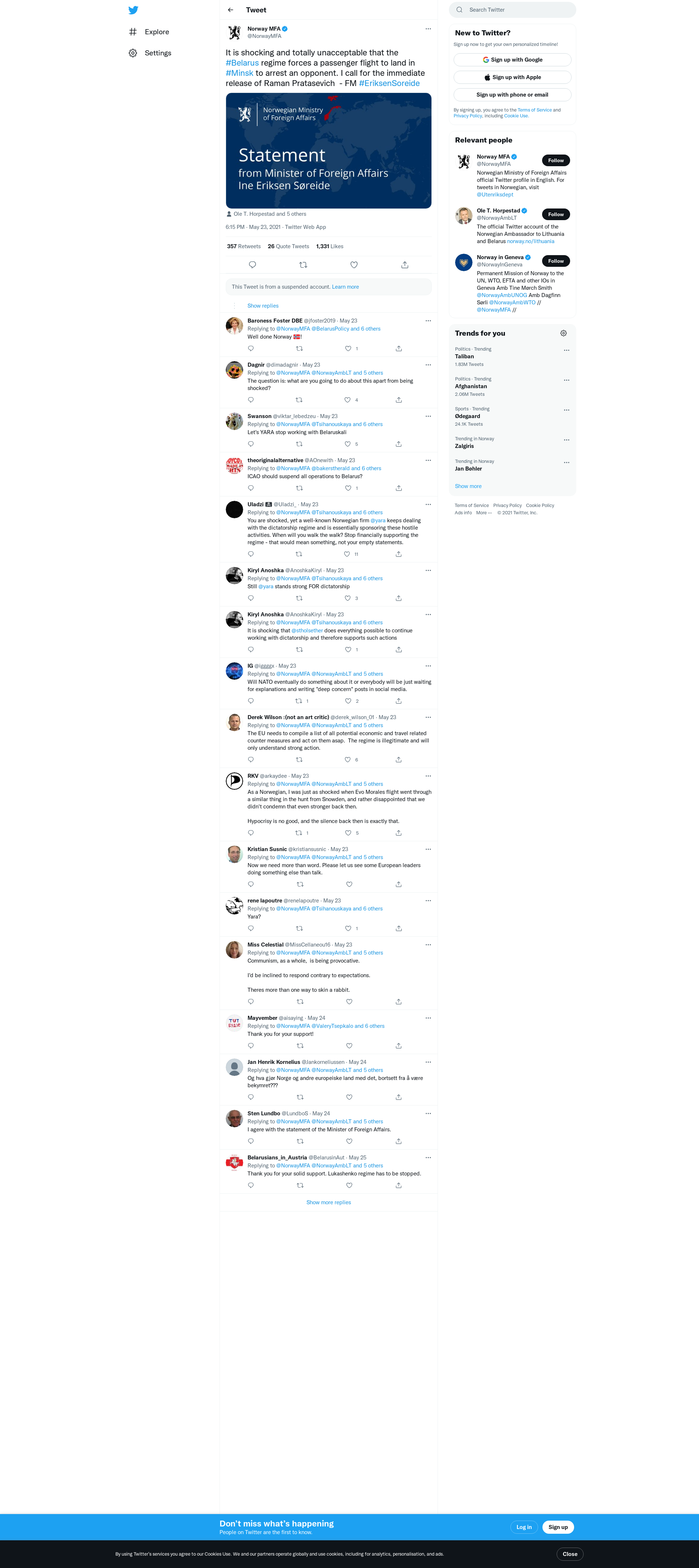 It is shocking and totally unacceptable that the #Belarus regime forces a passenger flight to land in #Minsk to arrest an opponent. I call for the immediate release of Raman Pratasevich - FM #EriksenSoreide https://t.co/zd7UHOcVoU